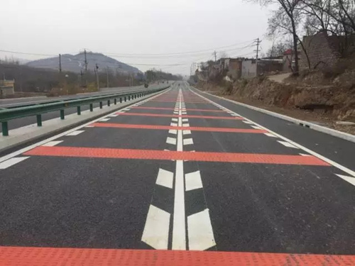 工程路線設(shè)計考慮人、車、路、環(huán)境四大要素,體現(xiàn)了以人為本的差異化設(shè)計理念。項(xiàng)目優(yōu)化調(diào)整了路線指標(biāo),沿線除設(shè)置縱向振動標(biāo)線外,橫向還設(shè)置了更加醒目的紅色振動標(biāo)線,既提高了車輛行駛的安全性,又提升了標(biāo)線視覺上的警示功能。