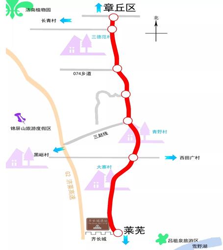 沿線旅游資源豐富,古文化遺跡眾多,直通齊長城、平郭城遺址、錦屏山風景區(qū)、呂祖泉旅游區(qū),途徑三德范、西王黑、大寨、田廣等歷史悠久古村鎮(zhèn),到萊蕪雪野湖景區(qū)僅需15分鐘車程。