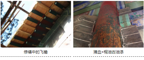 華陽宮現(xiàn)存古建多為明清建筑,建筑油漆都是采用“豬血+桐油”的古法油漆,此次修繕過程中,涂刷的新油漆也全部采用該種古法工藝。