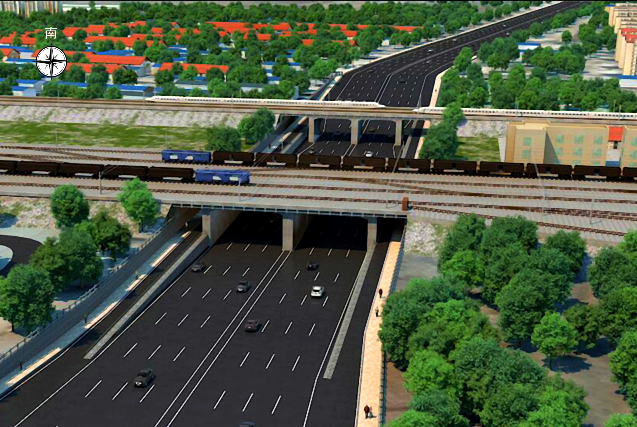 "車(chē)腳山隧道洞口效果圖"與"鳳凰路穿跨膠濟(jì)鐵路效果圖"