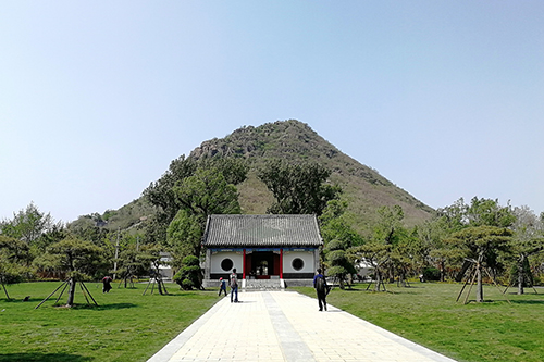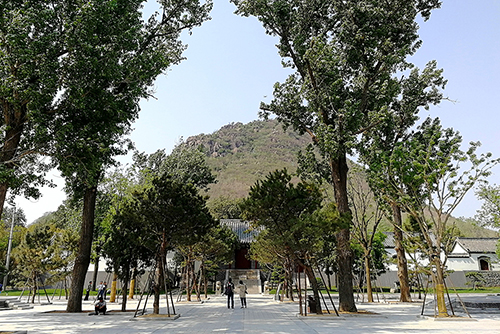 在綠地廣場面向一宮門,右側(cè)可以看到臥牛山的全貌,正面對視華山。兩側(cè)綠地每側(cè)精選了7棵造型油松,因?yàn)槿A陽宮道家文化的元素多些,此處也有北斗七星的意境。二是采用了借景、點(diǎn)景、框景的園林手法,借一宮門為背景,點(diǎn)造型松為景物,框出清晰的山體輪廓的畫面。