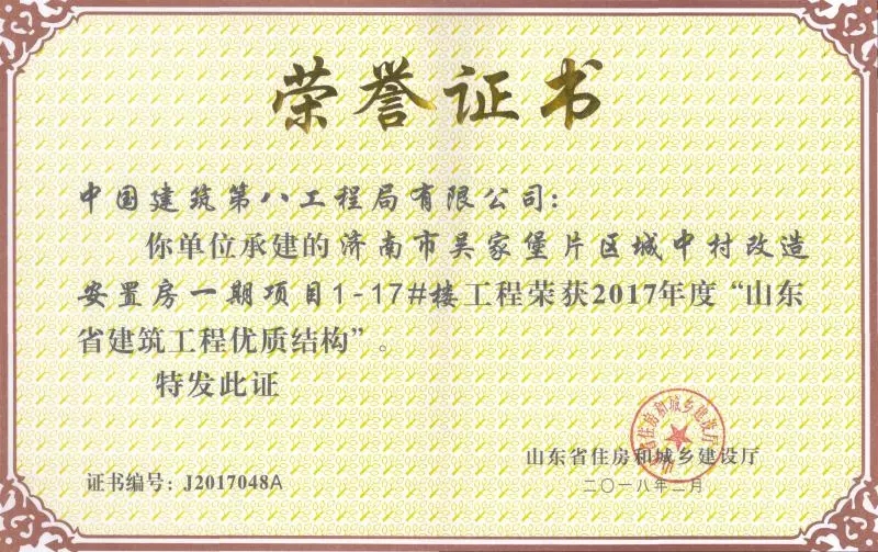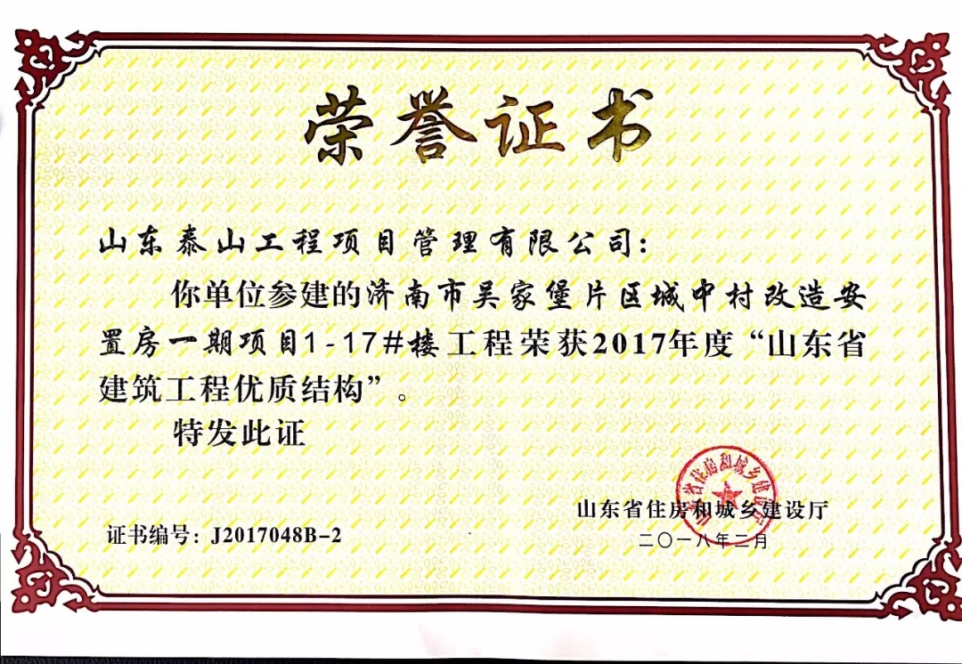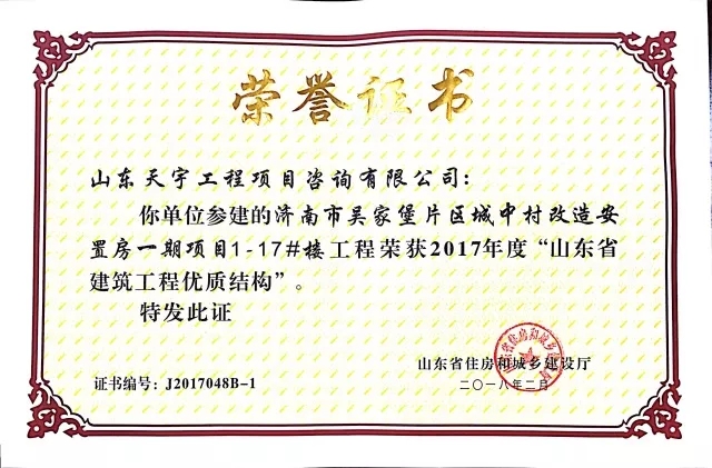 質(zhì)量是企業(yè)的生命。在山東省住房和城鄉(xiāng)建設(shè)廳組織的2017年度“山東省建筑工程優(yōu)質(zhì)結(jié)構(gòu)”評(píng)審中,吳家堡片區(qū)安置房一期工程1#到17#樓(共計(jì)17棟樓),憑借過(guò)硬的質(zhì)量、完善的管理順利通過(guò)專(zhuān)家考評(píng),喜獲“山東省建筑工程優(yōu)質(zhì)結(jié)構(gòu)”。“山東省建筑工程優(yōu)質(zhì)結(jié)構(gòu)”代表著全省各建筑企業(yè)施工質(zhì)量管理的領(lǐng)先水平,為沖刺山東省建筑工程質(zhì)量最高榮譽(yù)“泰山杯”奠定了基礎(chǔ)。
