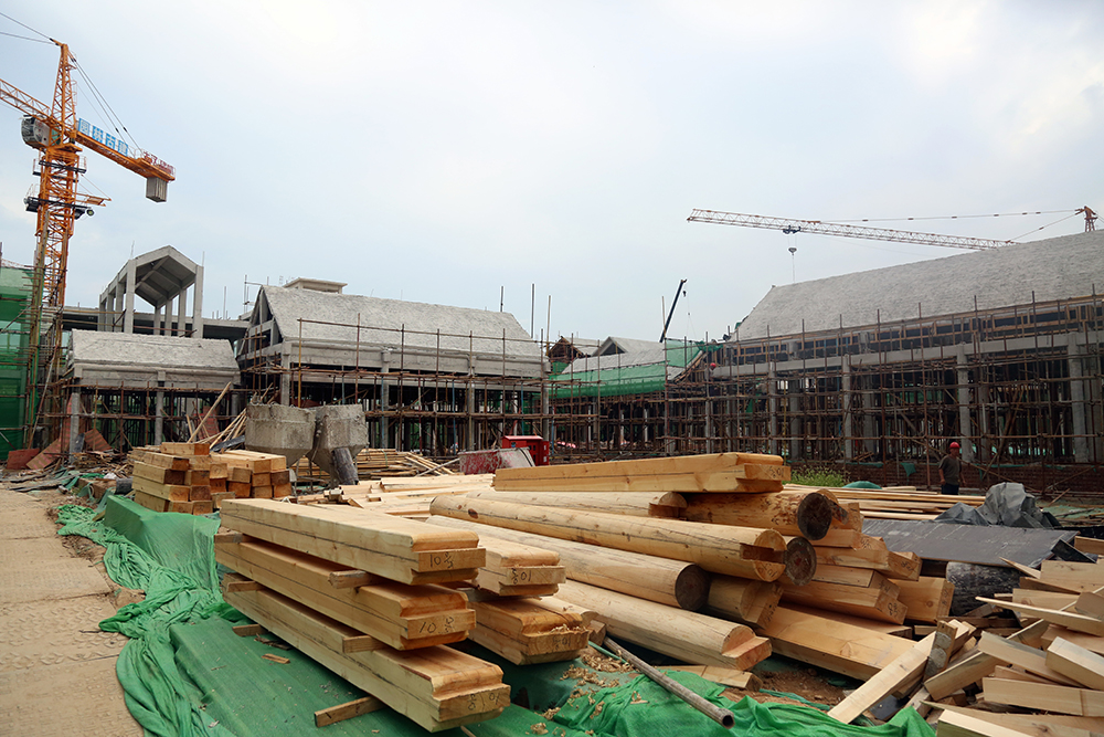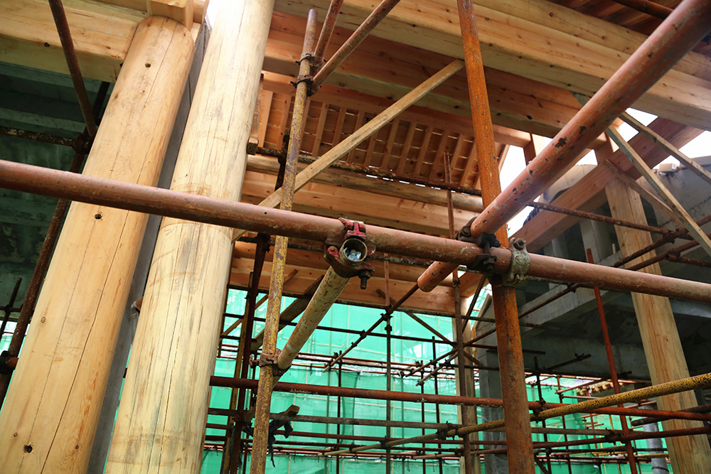 為消防安全考慮,項(xiàng)目建筑的屋頂及大部分構(gòu)件都摒棄了木質(zhì)結(jié)構(gòu),統(tǒng)一采用鋼筋混凝土結(jié)構(gòu)。雖然采用了現(xiàn)代材料,但是施工復(fù)雜程度卻比原始工藝大的多。“屋頂?shù)臉?gòu)件要用專門定制的模板逐層澆筑,較長(zhǎng)的房梁還要逐段拼接,同時(shí)又要保證細(xì)節(jié)到位,做起來(lái)就比較耗時(shí)”,現(xiàn)場(chǎng)負(fù)責(zé)人介紹道。在項(xiàng)目入口處,有一棟小型建筑為全木制結(jié)構(gòu),據(jù)介紹,這棟建筑僅用三天就建造完成,而如果采用鋼筋混凝土結(jié)構(gòu),至少需要20天工期。