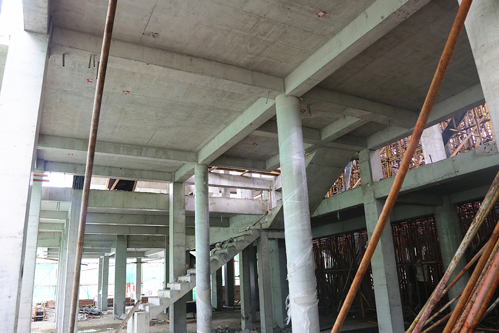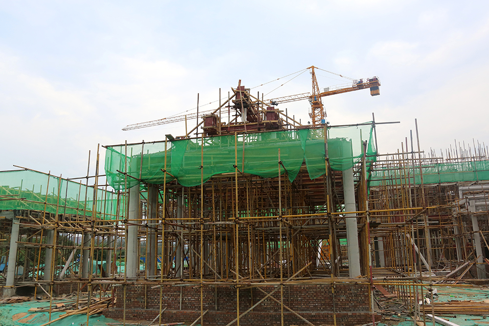 城門樓的工程量最大,項(xiàng)目?jī)?nèi)施工難度最大的是緊靠城門樓的一棟2.5層(局部三層)的中西結(jié)合建筑,該建筑內(nèi)部為錯(cuò)層結(jié)構(gòu),樓板需要逐層澆筑,同時(shí)還有單層挑高8米的高支模(高支模是指支模高度大于或等于5m時(shí)的支模作業(yè))作業(yè),施工方案經(jīng)專家反復(fù)論證后施行,為保證工期,這棟2.5層的“小建筑”最多80位工人同時(shí)施工。同樣,為了整個(gè)項(xiàng)目的推進(jìn)速度,項(xiàng)目高峰作業(yè)期400多位工人同時(shí)施工,保證項(xiàng)目按質(zhì)按量推進(jìn)。