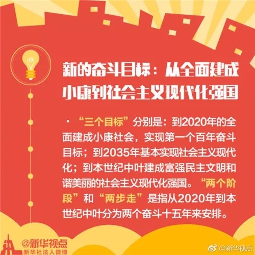在新世紀(jì)新時(shí)代,經(jīng)濟(jì)和社會(huì)發(fā)展的戰(zhàn)略目標(biāo)是,到建黨一百年時(shí),全面建成小康社會(huì);到新中國成立一百年時(shí),全面建成社會(huì)主義現(xiàn)代化強(qiáng)國。