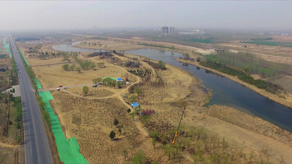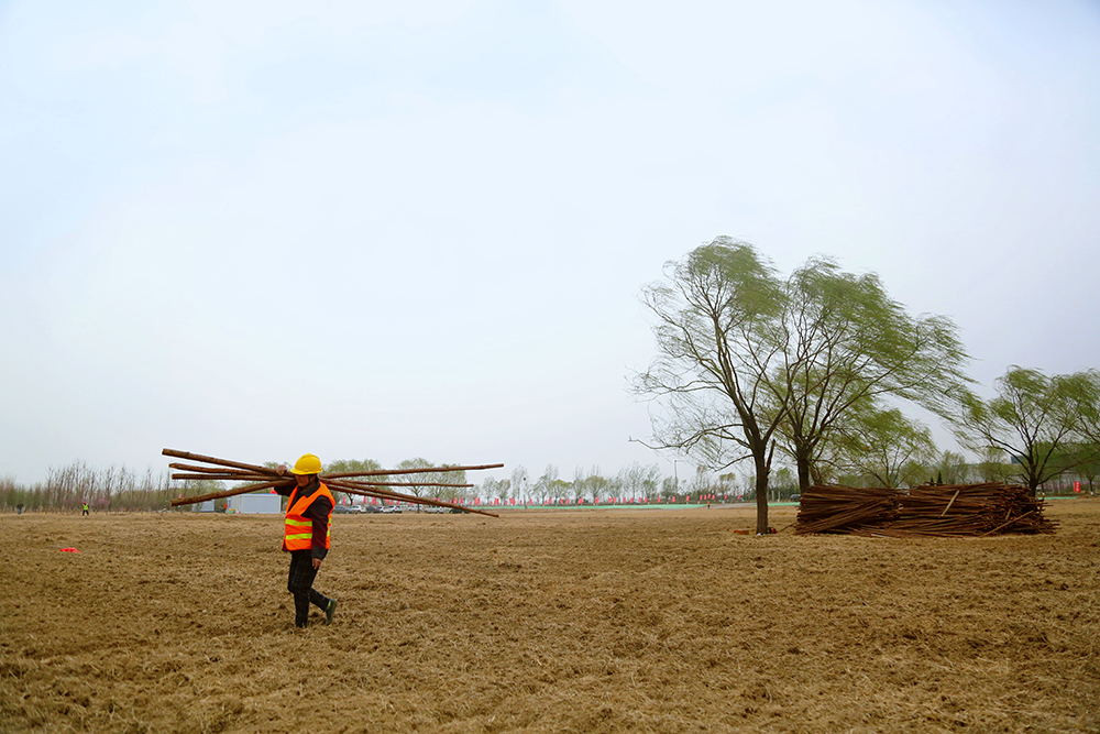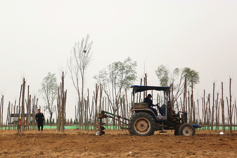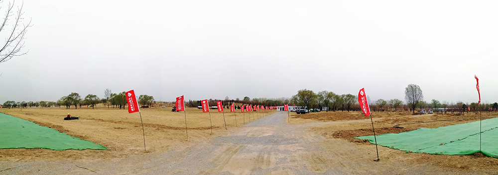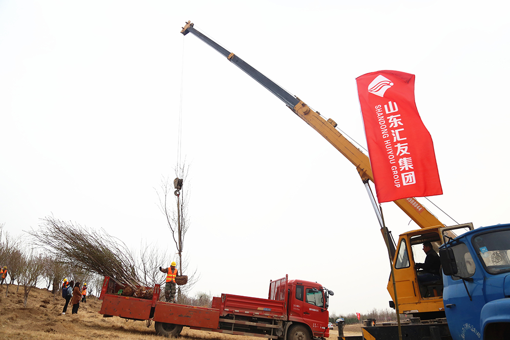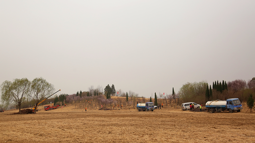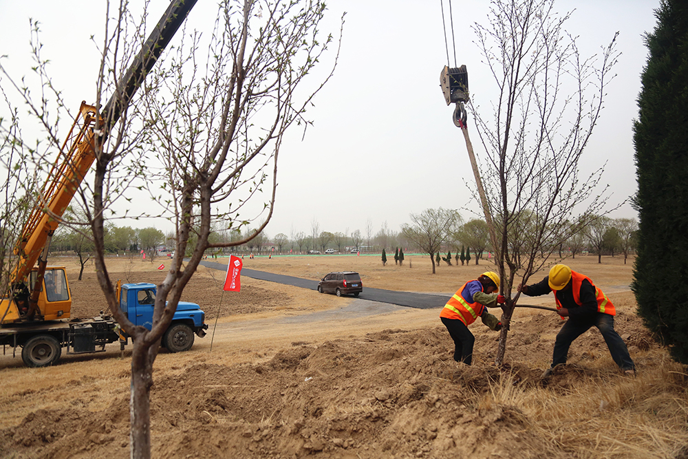 負責項目具體建設的匯友園林公司在接到工作任務后,迅速響應,3月24日全面調(diào)度,組建成立了40人的項目部,3月26日正式進場施工。截至目前,項目已搭建完成辦公室、會議室、宿舍、廁所等辦公配套設施,已進揚大型挖掘機5臺、小型挖掘機10臺、控坑機6臺、旋耕梨5臺、吊車3臺、水車5部。在300余人施工隊伍的奮力推進下,目前已整地15000平米、挖樹坑12000個、栽苗1500棵。近期,計劃5天內(nèi)鋪設管道5000米,6天挖坑30000個,10天栽苗40000棵(309北側(cè)20米及北岸未定)。