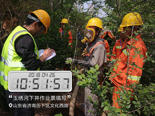 由于人工下井作業(yè)危險(xiǎn)較大,方案制定完成后搶險(xiǎn)小組立即向公司安全質(zhì)量部進(jìn)行匯報(bào),經(jīng)過(guò)安全質(zhì)量部批準(zhǔn)于4.26日進(jìn)行人工下井作業(yè)?,F(xiàn)場(chǎng)工作人員嚴(yán)格按照下井作業(yè)施工流程,認(rèn)真填寫《下井作業(yè)票》、《有限空間作業(yè)票》等最終將工作人員將阻塞在管口的立沿石等阻塞物取出,管道又恢復(fù)了正常運(yùn)行,玉繡河也恢復(fù)了往日的清澈。