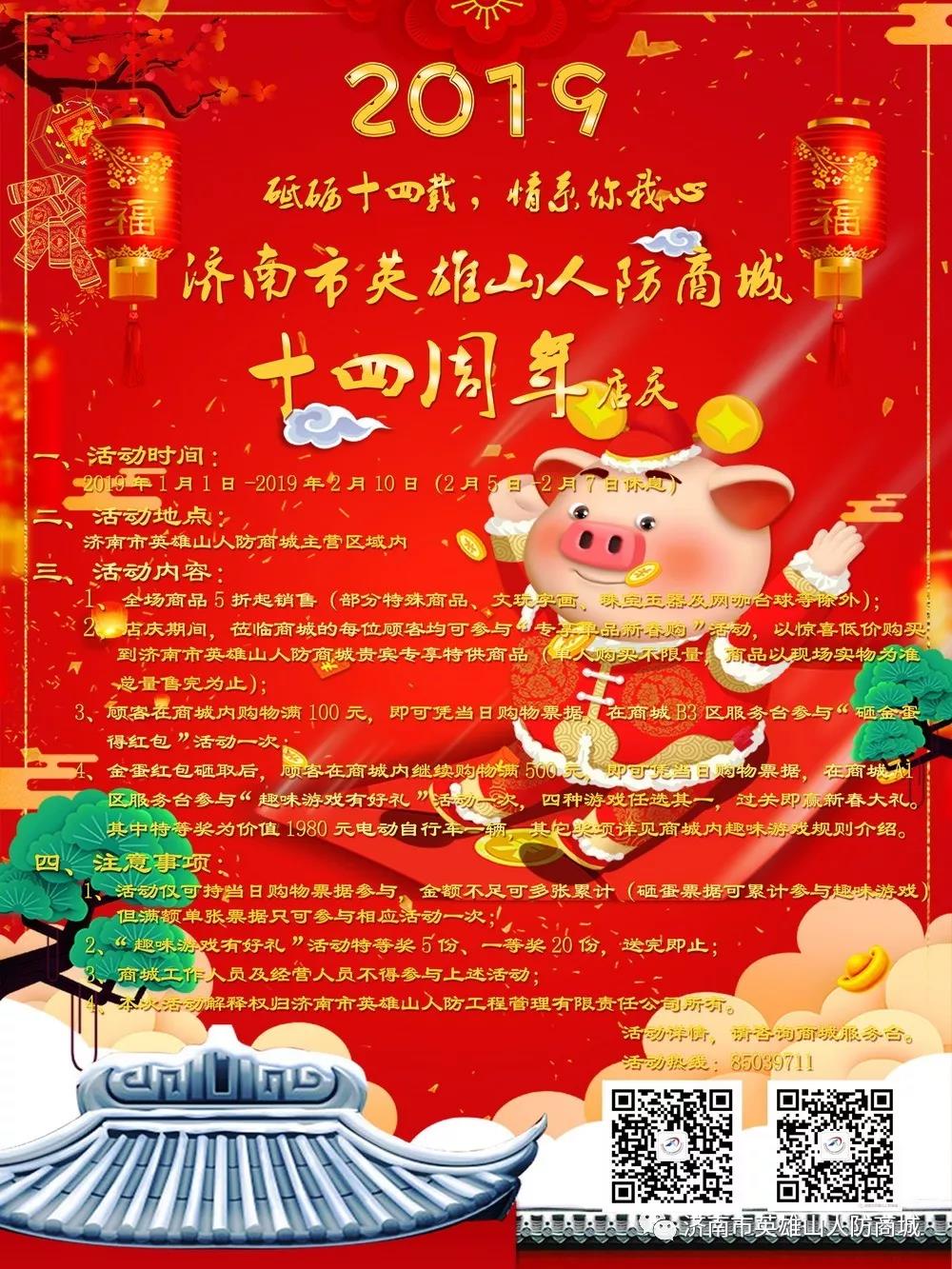 “十全十美,四海承平”。濟南市英雄山人防商城“相伴十四周年,共迎美好新年”主題十四周年店慶系列惠民活動將于二〇一九年元月一日正式啟動!