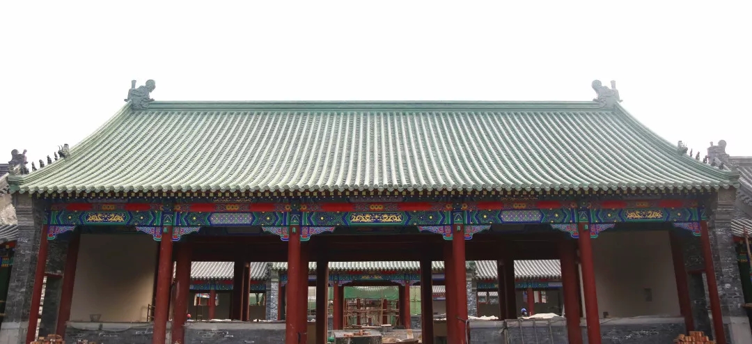 項(xiàng)目中仿古建筑的涂刷油漆部分做地仗都是采用“豬血+桐油”的古法油漆(“地仗”是一種采用“一麻五灰”的古老傳統(tǒng)工藝的施工做法)。仿古地仗油漆成活一般需要基層處理、下竹釘、捉縫灰、通灰、裹布等12道工序。清代彩繪的種類非常豐富,從紋飾的主體框架構(gòu)圖和題材方面分類可分五大類:和璽類、旋子類、蘇式類、海墁類和吉祥草類。“親王府”區(qū)域的建筑彩繪主要采用了三種繪畫形式,王府中軸線上建筑部分采用旋子墨線小點(diǎn)金彩繪,體現(xiàn)為輪廓線均用墨線,花心點(diǎn)金的形式;配房部分采用雅伍墨旋子彩繪,指完全不用金,線條用墨,旋子用藍(lán)、綠、白、黑四色,花瓣不起暈;長廊與園林部分的小型建筑部分采用蘇式彩繪,蘇式彩繪畫面內(nèi)容豐富,自然山水、花鳥魚蟲、各式人物一應(yīng)俱全。彩繪待地仗完成后還需依次為:丈量起譜子、刷生油、磨平、過水布、分中、打普子、瀝大小粉等13道工序。