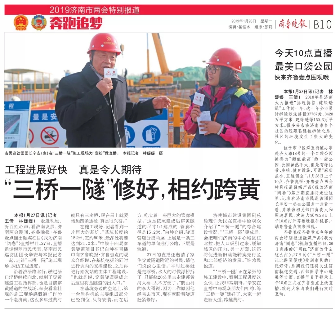走進現(xiàn)場,聽百姓心聲,看濟南發(fā)展,濟南兩會期間,齊魯晚報·齊魯壹點推出融媒欄目《我為濟南“閱卷”》直播欄目。1月27日,模范市民代表、濟南市民巡訪團團長辛安與齊魯晚報記者一起,走進濟南黃河隧道施工現(xiàn)場,探訪“三橋一隧”工程進度。