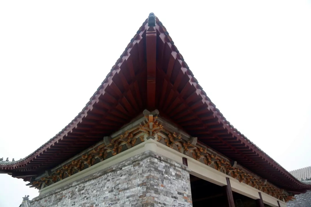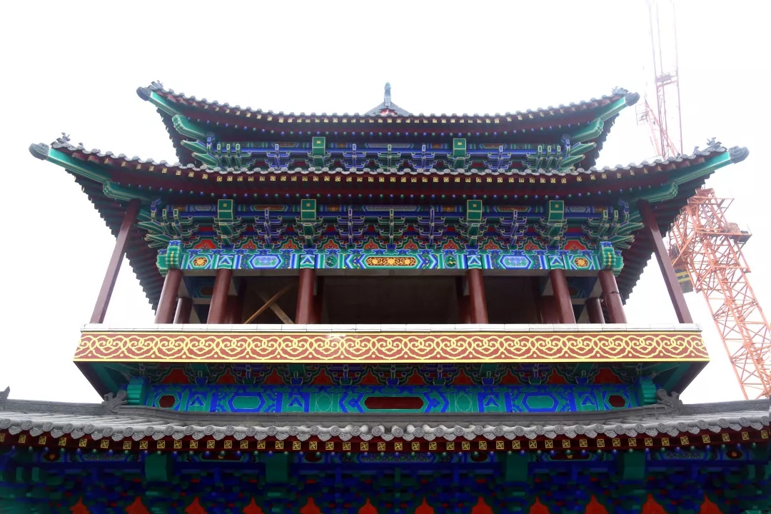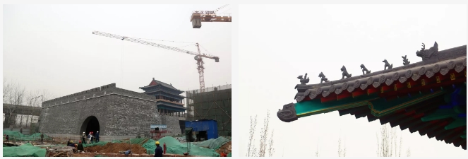 項目所有建筑中,城門樓是工程量最大、工期最長的單體建筑,其中,城墻全部采用手工磚砌筑,經(jīng)過人工修整后的磚塊古樸素雅,并無過分雕飾痕跡。進入城門樓內(nèi)部,柱與梁之間均為傳統(tǒng)木質(zhì)斗拱支撐,城門樓的彩繪部分尤為明亮突出,采用的是旋子彩繪形式,一般經(jīng)過6道工序,一平方米的彩繪需要一名繪畫師傅耗時約半天一次成型。