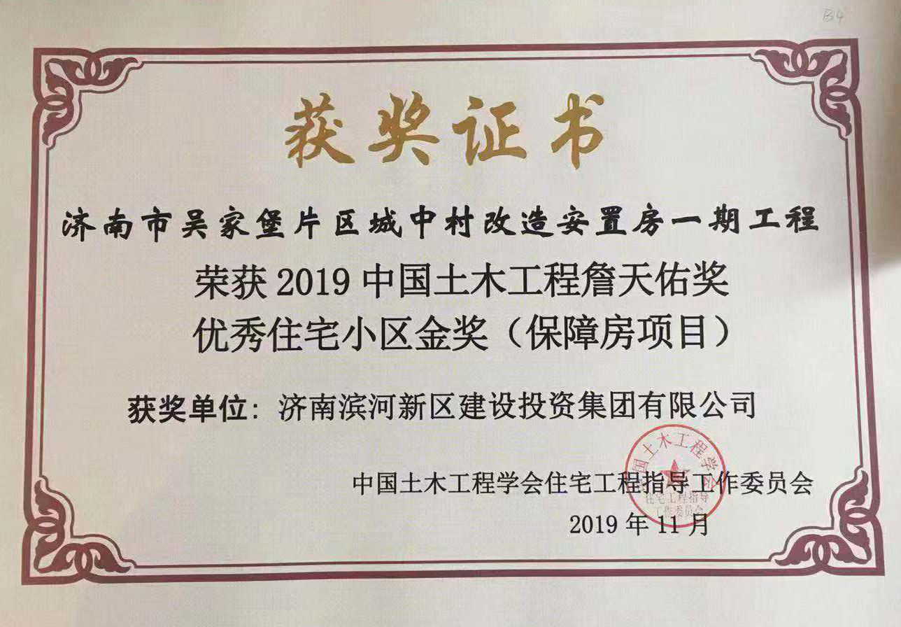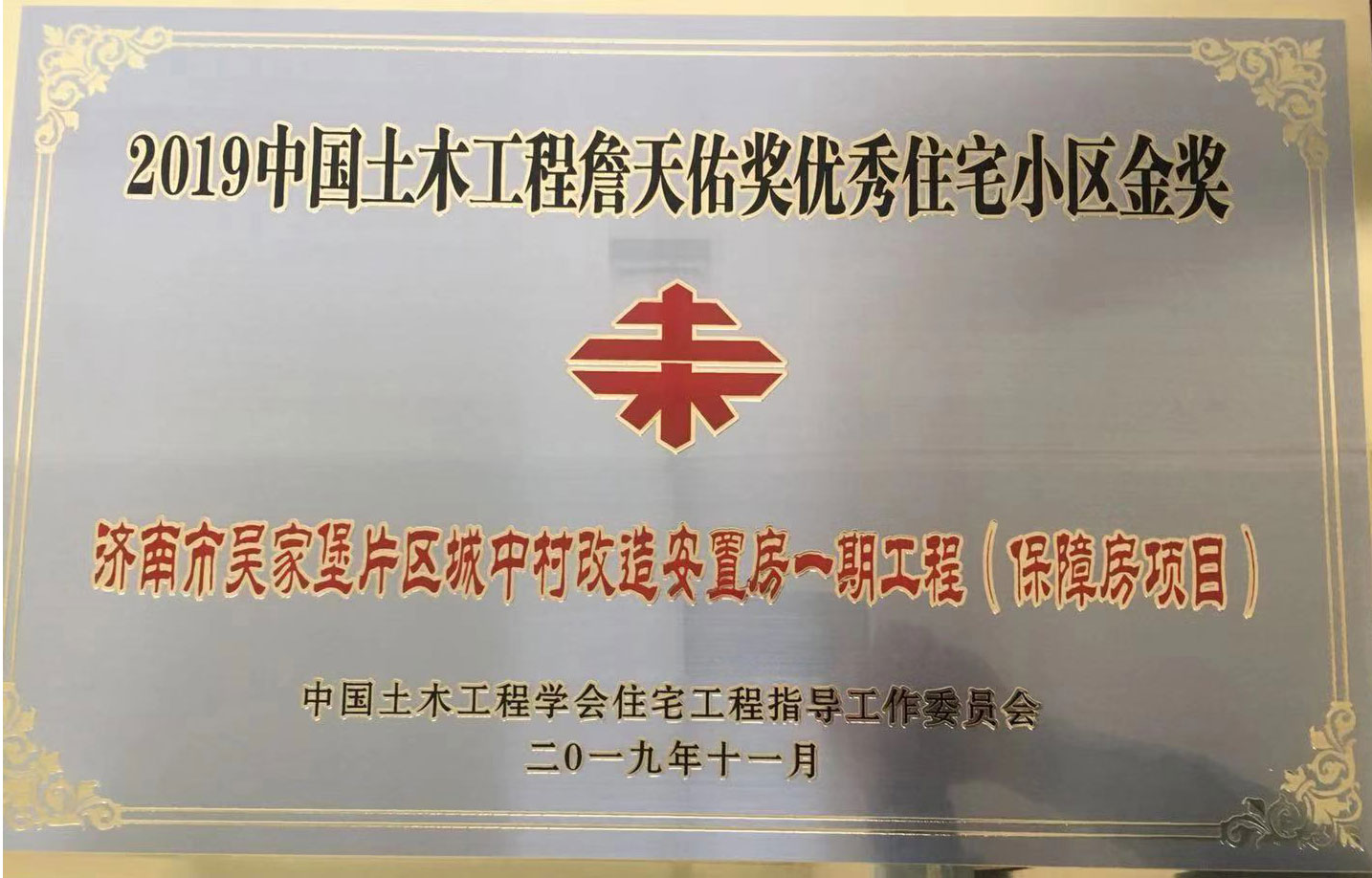 弘揚(yáng)工匠精神,打造精品工程。作為濟(jì)南市第一個(gè)多村整合的城中村改造項(xiàng)目,近日,由濟(jì)南城市建設(shè)集團(tuán)負(fù)責(zé)建設(shè)的吳家堡片區(qū)城中村改造安置房一期工程(以下簡(jiǎn)稱(chēng)吳家堡安置房一期)榮獲2019中國(guó)土木工程詹天佑獎(jiǎng)優(yōu)秀住宅小區(qū)金獎(jiǎng)。