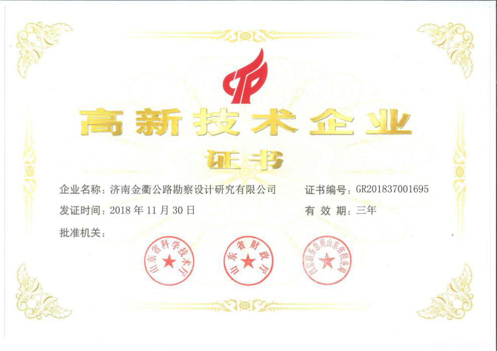 2019年3月14日,金衢公司喜獲由山東省科學技術廳、山東省財政廳、山東省國家稅務局和山東省地方稅務局聯(lián)合頒發(fā)的高新技術企業(yè)證書,這標志著金衢公司正式邁入國家級高新技術企業(yè)行列。