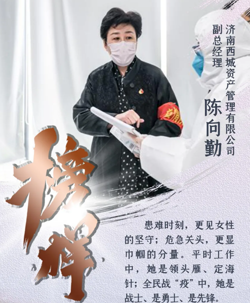 患難時(shí)刻,更見女性的堅(jiān)守;危急關(guān)頭,更顯巾幗的分量。平時(shí)工作中,她是領(lǐng)頭雁、定海針;全民戰(zhàn)“疫”中,她是戰(zhàn)士、是勇士、是先鋒。作為200多萬平方國有資產(chǎn)的“守護(hù)者”,陳向勤一直堅(jiān)守在資產(chǎn)管理一線,制定并落實(shí)防控預(yù)案及標(biāo)準(zhǔn)化操作,部署建立三級(jí)防控體系,為國有資產(chǎn)疫情防控樹立了新標(biāo)桿。她帶動(dòng)西城資產(chǎn)人同心戰(zhàn)“疫”,筑起一道守護(hù)國有資產(chǎn)安全的鋼鐵防線。