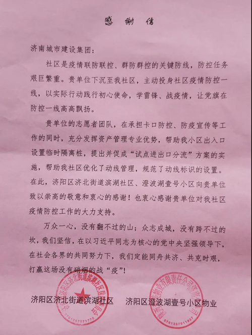 4月20日下午,在集團第十一批下沉社區(qū)疫情防控服務隊即將完成執(zhí)勤任務之時,濟陽、濟北街道社區(qū)將四面錦旗和一封飽含深情的感謝信送到志愿者手中,表達對濟陽、濟北小組志愿者的感謝與認可。