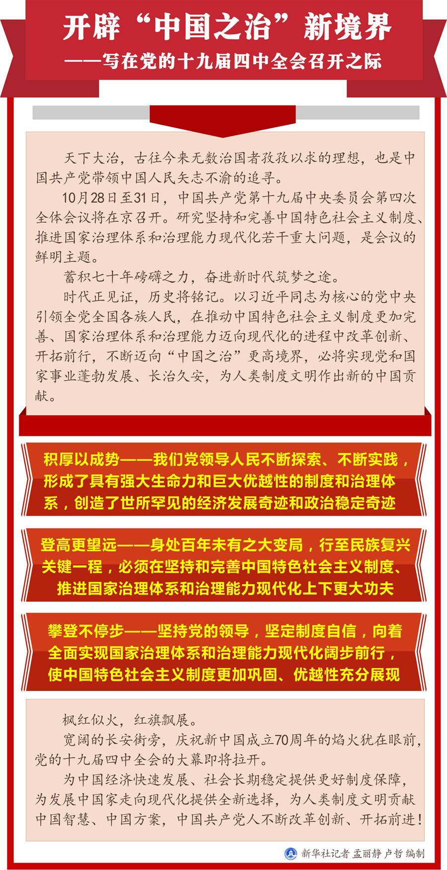 10月28日至31日,中國(guó)共產(chǎn)黨第十九屆中央委員會(huì)第四次全體會(huì)議將在京召開。研究堅(jiān)持和完善中國(guó)特色社會(huì)主義制度、推進(jìn)國(guó)家治理體系和治理能力現(xiàn)代化若干重大問(wèn)題,是會(huì)議的鮮明主題。
