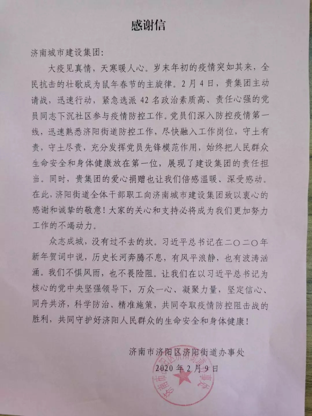 濟(jì)陽街道辦事處專門給集團(tuán)寫了感謝信,濟(jì)陽街道康瑞社區(qū)與雅居園物業(yè)管理有限公司還向呂仁鎮(zhèn)、齊鵬飛兩名黨員同志贈(zèng)送了寫有“抗擊疫情勇?lián)?dāng),志愿服務(wù)爭(zhēng)先鋒”的錦旗。