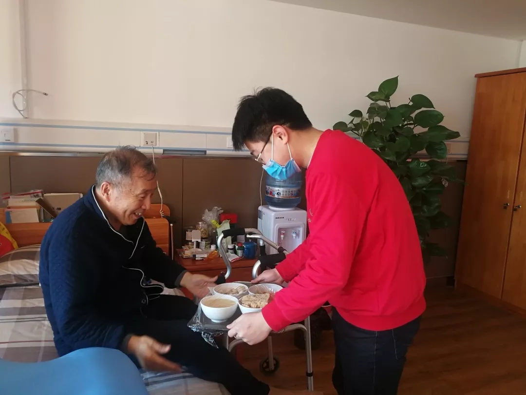 在介護(hù)區(qū),我們還看到了兩位正在忙碌的“95后”小伙子。97年出生的陳安義,家住德州,本來已經(jīng)買好了回家的車票,接到抗擊疫情的通知,第一時間退了車票主動請戰(zhàn)。98年出生的欒希浩,老家在煙臺,也是放棄了春節(jié)假期,跟陳安義兩人共同負(fù)責(zé)介護(hù)區(qū)二樓的四戶長者。