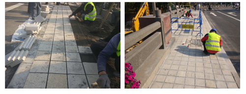 人行道花磚嚴格掛線施工,砂漿鋪設飽滿,勾縫細致。