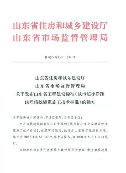 近日,山東省住房和城鄉(xiāng)建設(shè)廳與山東省市場(chǎng)監(jiān)督管理局聯(lián)合下發(fā)魯建標(biāo)字[2019]32號(hào)文《關(guān)于發(fā)布山東省工程建設(shè)標(biāo)準(zhǔn)〈城市超小凈距淺埋暗挖隧道施工技術(shù)標(biāo)準(zhǔn)〉的通知》,宣布由城建集團(tuán)主編的該標(biāo)準(zhǔn)業(yè)經(jīng)審定通過,批準(zhǔn)為山東省工程建設(shè)標(biāo)準(zhǔn),編號(hào)為DB37/T 5152-2019,予以發(fā)布,自2020年5月1日起施行。這是城建集團(tuán)主編并已發(fā)布的第九部山東省工程建設(shè)標(biāo)準(zhǔn),對(duì)省內(nèi)隧道施工起到了一定的規(guī)范指導(dǎo)作用。