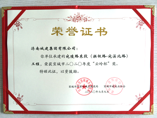 近日,由集團(tuán)所屬濟(jì)南城建集團(tuán)有限公司承建的宣城市水陽江大道閉合段北段工程PPP項(xiàng)目、宛陵東路(拱極路—宛溪北路)工程榮獲宣城市2020年度“云嶺杯”獎。