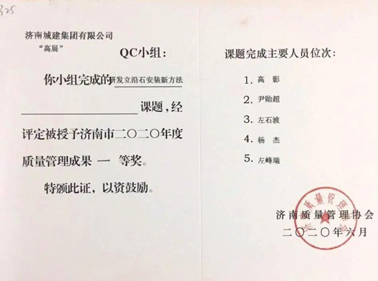 經(jīng)濟(jì)南質(zhì)量管理協(xié)會專家組評審,濟(jì)南城建集團(tuán)有限公司報(bào)送的QC成果榮獲一等獎5項(xiàng)、二等獎4項(xiàng),濟(jì)南城建集團(tuán)有限公司的城市隧道項(xiàng)目班組、701項(xiàng)目班組、盾構(gòu)施工管理班組、804項(xiàng)目班組等共有7個(gè)班組榮獲“2020年度濟(jì)南市質(zhì)量信得過班組”稱號。另外,張勝安等3名員工獲得“2020年度濟(jì)南市優(yōu)秀質(zhì)量管理先進(jìn)工作者”稱號。