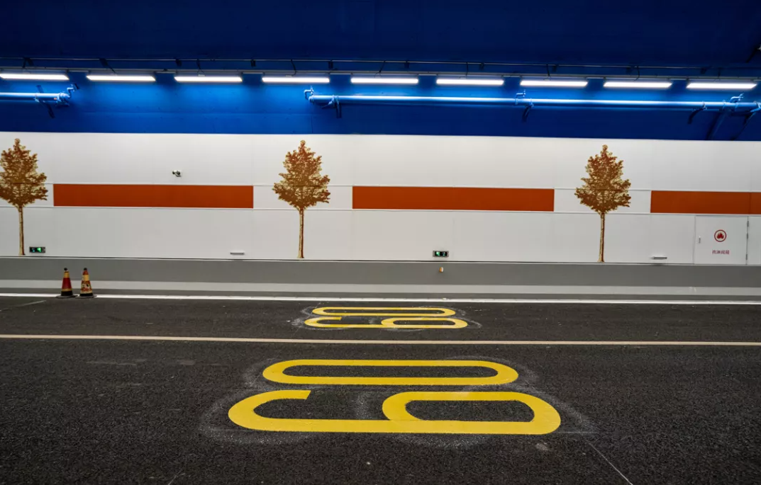 保持隧道主體工程結(jié)構(gòu)不變,通過增加裝飾,實現(xiàn)整體設計提升。隧道南北出口聲屏障以“歲歲九曲彎”和“歲歲安瀾”為設計主題,以中國傳統(tǒng)裝飾紋樣呈現(xiàn),夜晚還將呈現(xiàn)“日出黃河”的燈光效果。添加“流動”與“水紋”的造型體現(xiàn)了黃河穿越之美,在隧道內(nèi)采用3D打印貼膜工藝繪制白楊樹(寓意堅韌、表達力求上進的精神),以緩解駕駛員視覺疲勞。同時以黃河星空為題,中間段頂部弧線的燈光表現(xiàn)黃河穿越之感,暖色照明設計表現(xiàn),感受黃河星空光線流動之美。