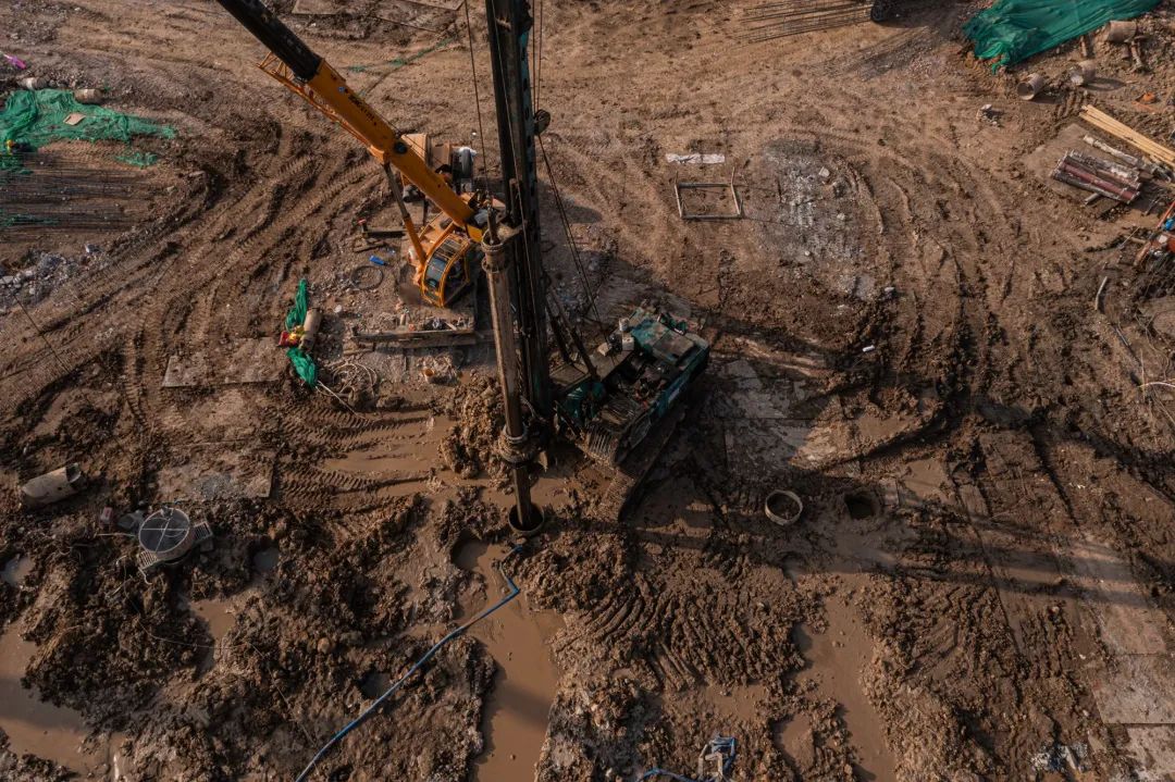 樁基施工準(zhǔn)備階段,根據(jù)項目情況優(yōu)化編制基礎(chǔ)工程施工組織方案,制定樁基施工布置圖,按基樁類型、特點(diǎn)劃分9個施工區(qū)域,明確基樁編號、施工順序、基樁檢測等策劃內(nèi)容,有效串聯(lián)設(shè)計、施工、監(jiān)理、檢測、驗(yàn)收等環(huán)節(jié)。在3萬平方米打樁區(qū)域,同時布置了20余臺旋挖鉆機(jī)、30余臺汽車吊、20余臺裝載機(jī),施工勞務(wù)人員300余人,投入9個施工區(qū)域24小時不間斷作業(yè)。自2021年10月22日開始全面鉆進(jìn),11月26日,澆筑完成最后一根樁基,山大二院項目全體人員迎難而上,酣戰(zhàn)月余,克服暴雪、大風(fēng)等惡劣天氣,施工日均完成樁基80余顆,順利完成2452顆樁基的施工,完成樁基產(chǎn)值約1億元,占項目建安總投資的4.2%。完成項目建設(shè)第一個里程碑節(jié)點(diǎn),實(shí)現(xiàn)全面進(jìn)入下步土方開挖施工節(jié)點(diǎn)跨越。