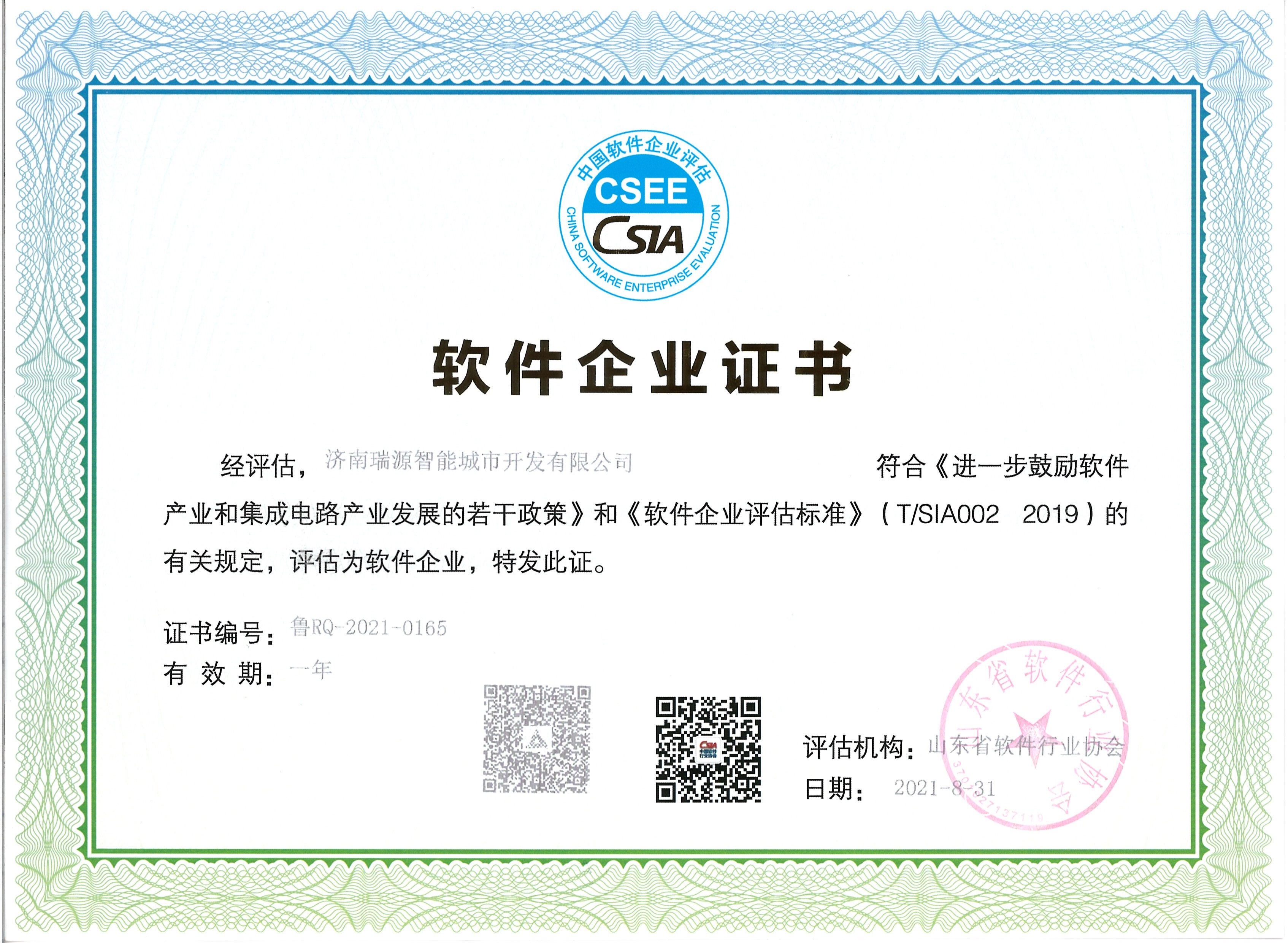 8月31日,濟(jì)南瑞源智能城市開發(fā)有限公司經(jīng)山東省軟件行業(yè)協(xié)會(huì)評(píng)估,符合《進(jìn)一步鼓勵(lì)軟件產(chǎn)業(yè)和集成電路產(chǎn)業(yè)發(fā)展的若干政策》和《軟件企業(yè)評(píng)估標(biāo)準(zhǔn)》的有關(guān)規(guī)定,獲評(píng)軟件企業(yè)證書。此證書獲得,標(biāo)志著公司在技術(shù)研發(fā)、軟件應(yīng)用等相關(guān)領(lǐng)域獲得了行業(yè)認(rèn)證資質(zhì),更是對(duì)公司技術(shù)先進(jìn)性和前沿性的充分認(rèn)可。