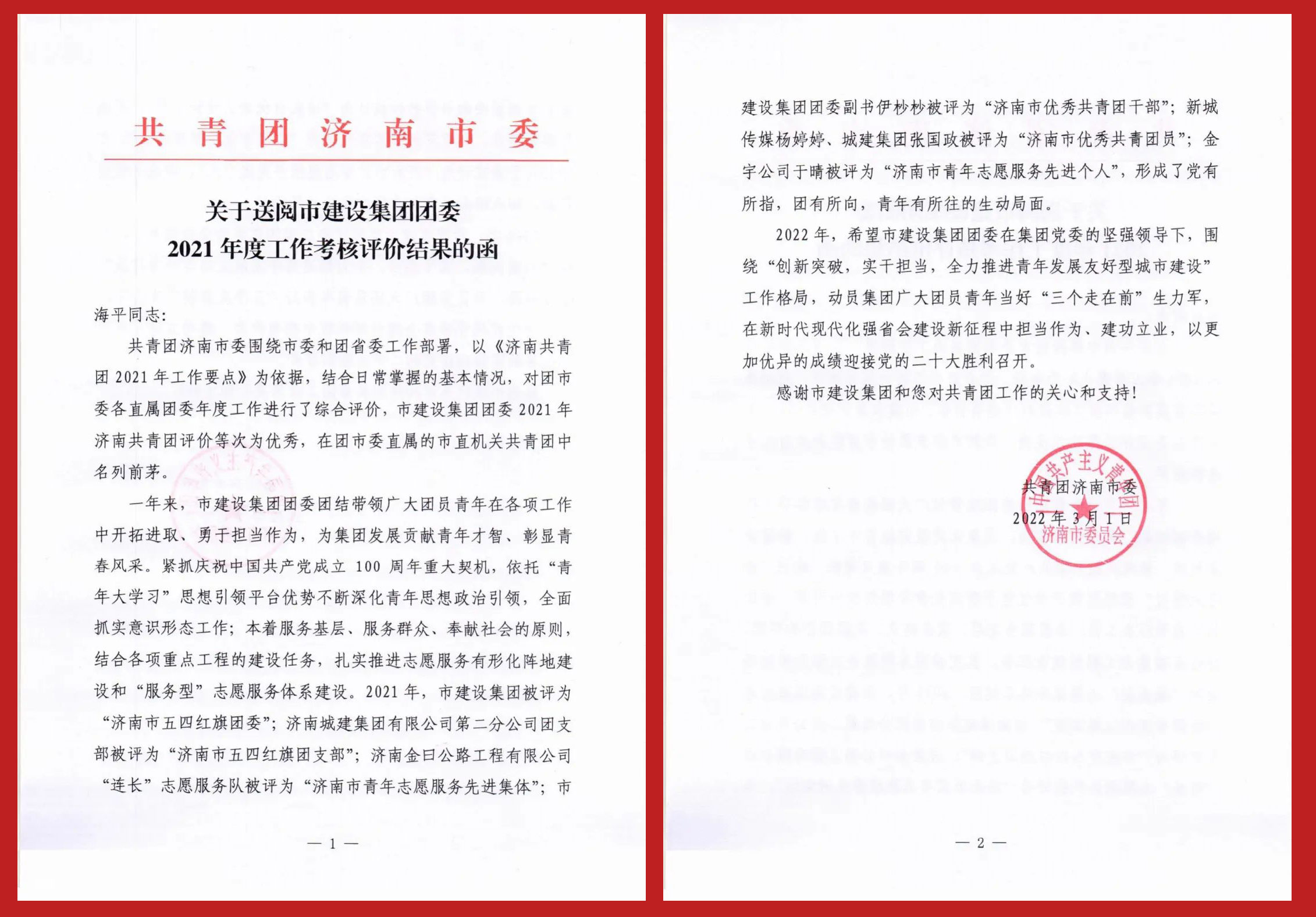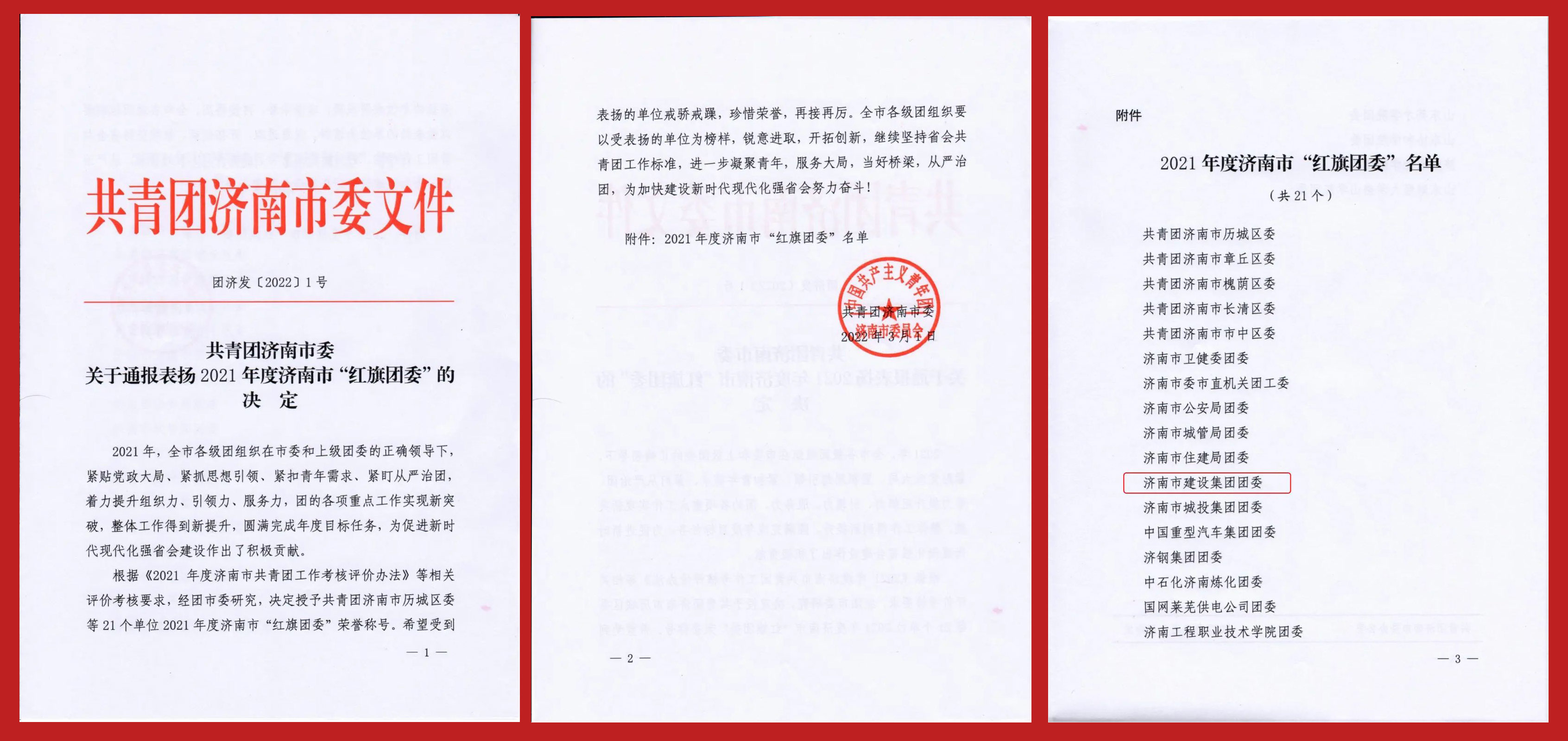 2022年3月1日,共青團濟南市十七屆四次全委(擴大)會議召開。會議通報了2021年度全市共青團工作綜合考核情況,建設(shè)集團團委被評為2021年度濟南市“紅旗團委”。共青團濟南市委向集團主要領(lǐng)導發(fā)來了《2021年建設(shè)集團團工作考核評價函》,并向集團對共青團工作的支持和關(guān)心表示了感謝。