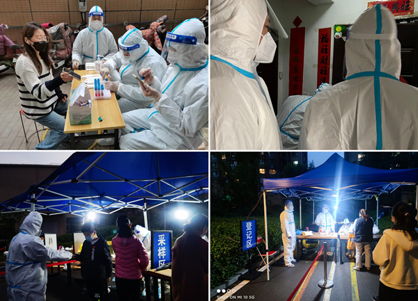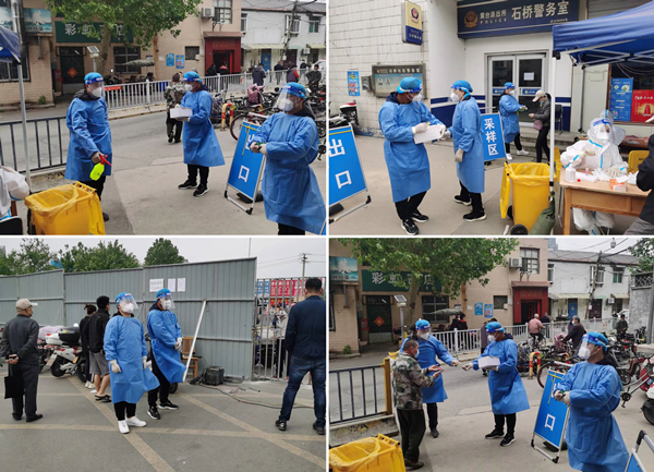 在石橋社區(qū),身著藍(lán)色工作服的青年突擊隊(duì)志愿者分工明確、相互配合,穿梭忙碌在核酸采樣現(xiàn)場:協(xié)助檢測、體溫測量、有序引導(dǎo)、登記信息、維持秩序、耐心講解。盡管現(xiàn)場下起了小雨,志愿者們冒雨作戰(zhàn),保持采樣工作有條不紊、順利推進(jìn),在規(guī)定時(shí)間內(nèi)圓滿完成社區(qū)采樣任務(wù),為石橋社區(qū)繪出一片堅(jiān)實(shí)的守衛(wèi)藍(lán)。