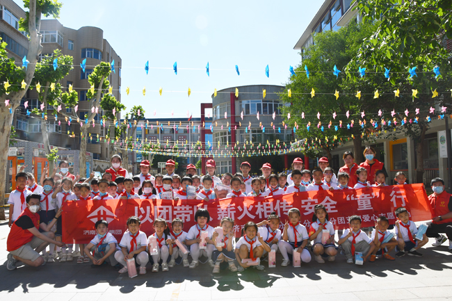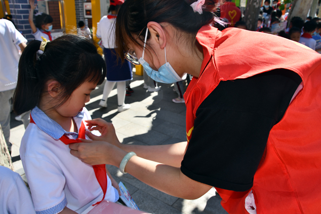 活動(dòng)中,志愿者身著紅色志愿者馬甲,與小朋友們進(jìn)行親密互動(dòng),為孩子們佩戴少先隊(duì)隊(duì)徽,以通俗易懂的方式為大家講解少先隊(duì)知識(shí)、安全防疫知識(shí),提醒提高安全防護(hù)意識(shí)。志愿者們與小朋友們有說(shuō)有笑,其樂(lè)融融,為小朋友們送去集團(tuán)的關(guān)愛(ài)和祝福,祝愿孩子們開(kāi)心快樂(lè)成長(zhǎng)。孩子們用整齊的少先隊(duì)禮回應(yīng)志愿者,稚嫩的童顏上洋溢著燦爛的笑容。