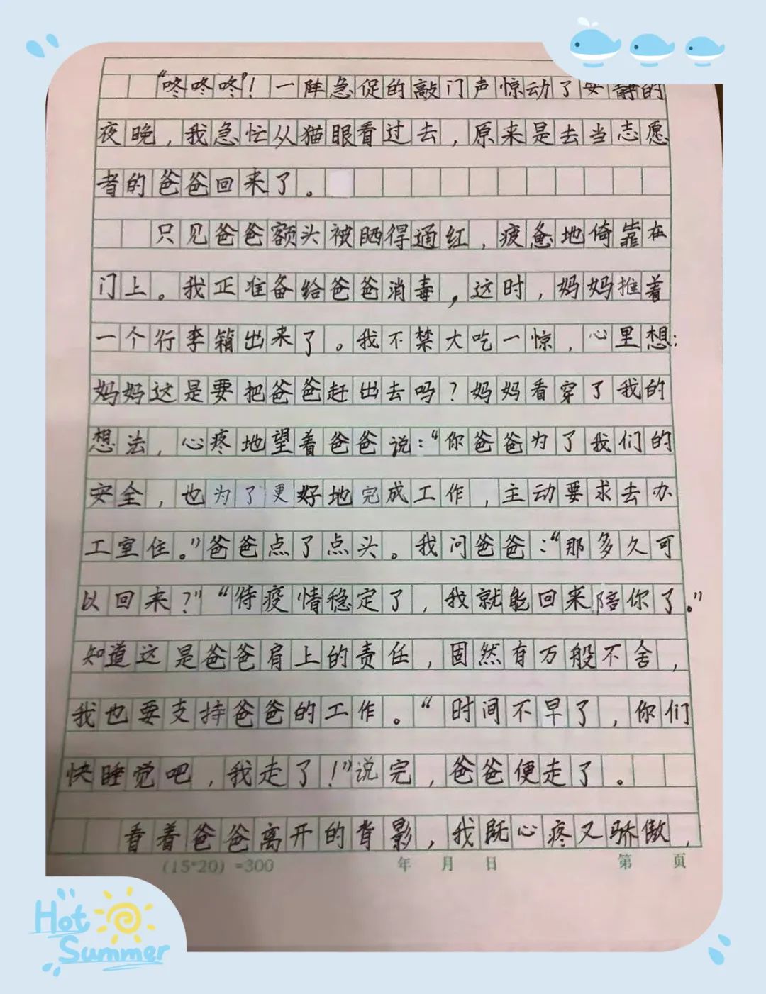 “知道這是爸爸肩上的責(zé)任,固然有萬般不舍,我也要支持爸爸的工作”“看著爸爸離開的背影,我既心疼又驕傲,心疼爸爸辛苦工作,但又為有這樣為人民服務(wù)的爸爸感到發(fā)自內(nèi)心的驕傲!”這是11歲的榮浩霖小朋友寫的作文“我的爸爸”。