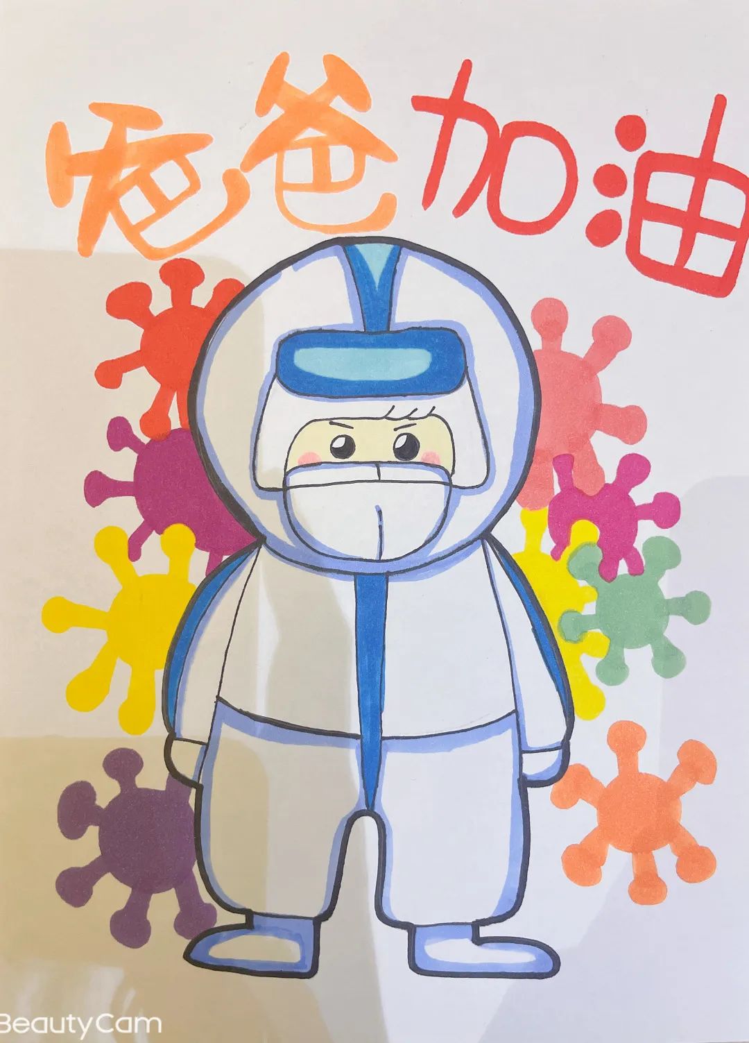 “爸爸加油”!這幅可愛的”大白”卡通畫,出自建設(shè)集團(tuán)所屬濟(jì)南城建集團(tuán)公司下沉南苑社區(qū)服務(wù)中心的志愿者杜謙12歲女兒之手。一身潔白的防護(hù)服,戴著厚實(shí)的口罩,只露出一雙炯炯有神目光堅(jiān)定的大眼睛,這是女兒心中爸爸最帥的形象。