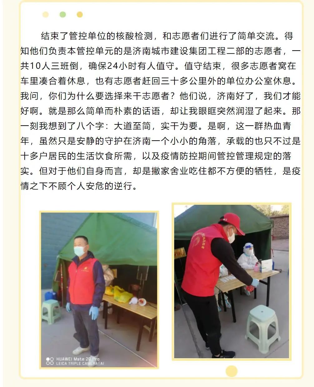 “他們說(shuō),濟(jì)南好了,我們才能好啊。簡(jiǎn)單而樸素的話語(yǔ),卻讓我眼眶突然潤(rùn)濕了起來(lái),那一刻我想到了八個(gè)字:大道至簡(jiǎn),實(shí)干為要。”近日,歷城區(qū)董家街道辦的工作人員在“愛董家”微信平臺(tái)上寫下了這樣的話,他口中的“他們”便是按照集團(tuán)統(tǒng)一部署下沉到董家街道社區(qū)的工程二部志愿者們。