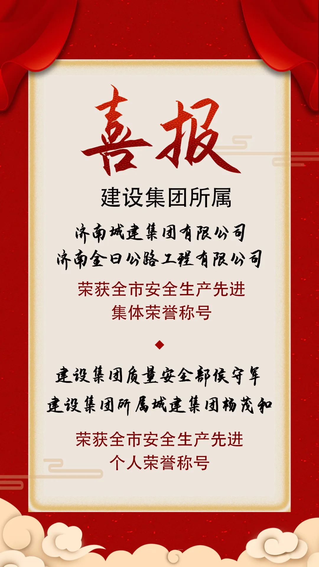 近日,濟(jì)南市安全生產(chǎn)委員會(huì)發(fā)布《關(guān)于表揚(yáng)全市安全生產(chǎn)先進(jìn)集體和先進(jìn)個(gè)人的通報(bào)》,建設(shè)集團(tuán)所屬濟(jì)南城建集團(tuán)有限公司和濟(jì)南金曰公路工程有限公司榮獲全市安全生產(chǎn)先進(jìn)集體榮譽(yù)稱號(hào),建設(shè)集團(tuán)質(zhì)量安全部侯守軍,建設(shè)集團(tuán)所屬濟(jì)南城建集團(tuán)有限公司楊茂和榮獲全市安全生產(chǎn)先進(jìn)個(gè)人榮譽(yù)稱號(hào)。