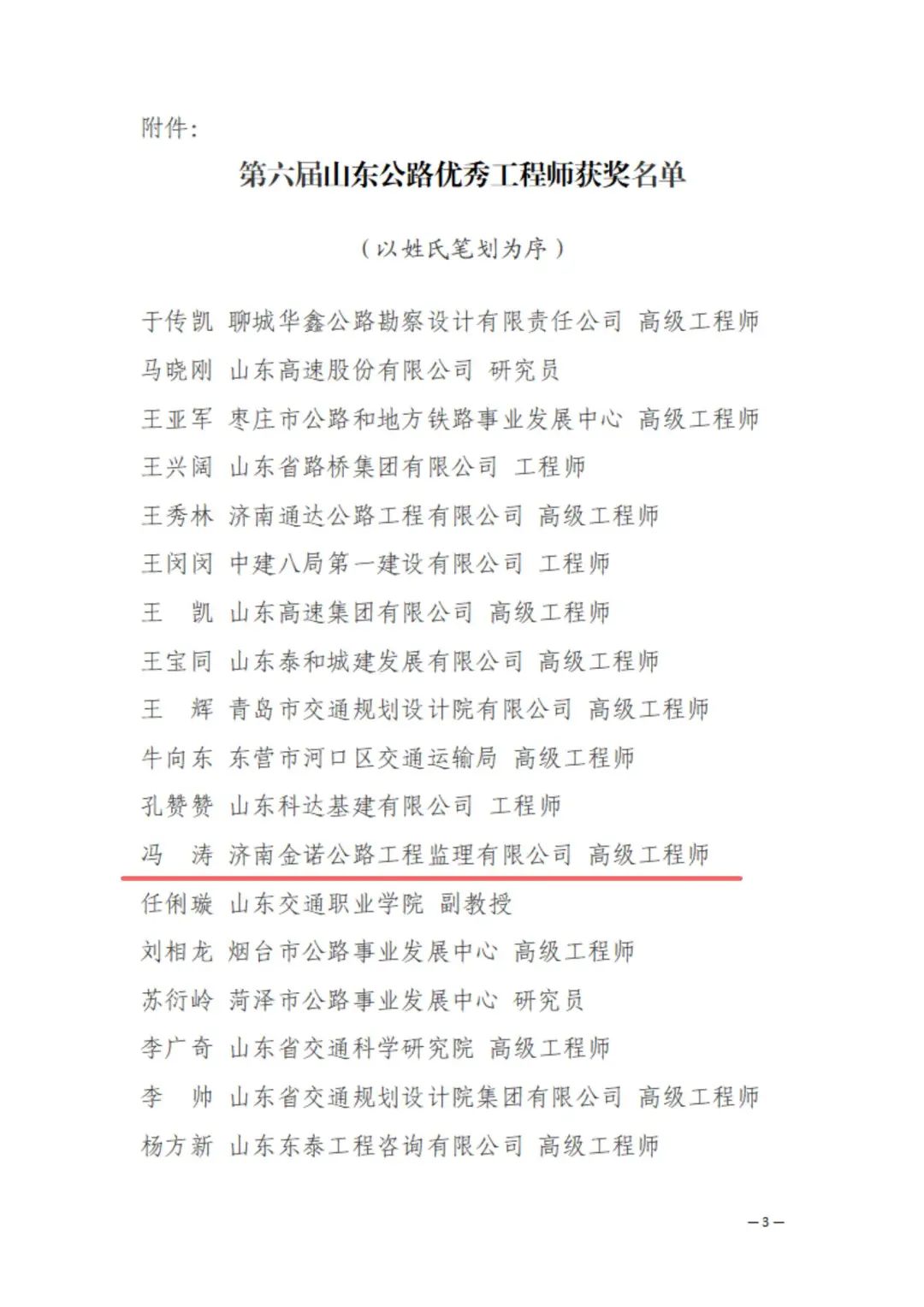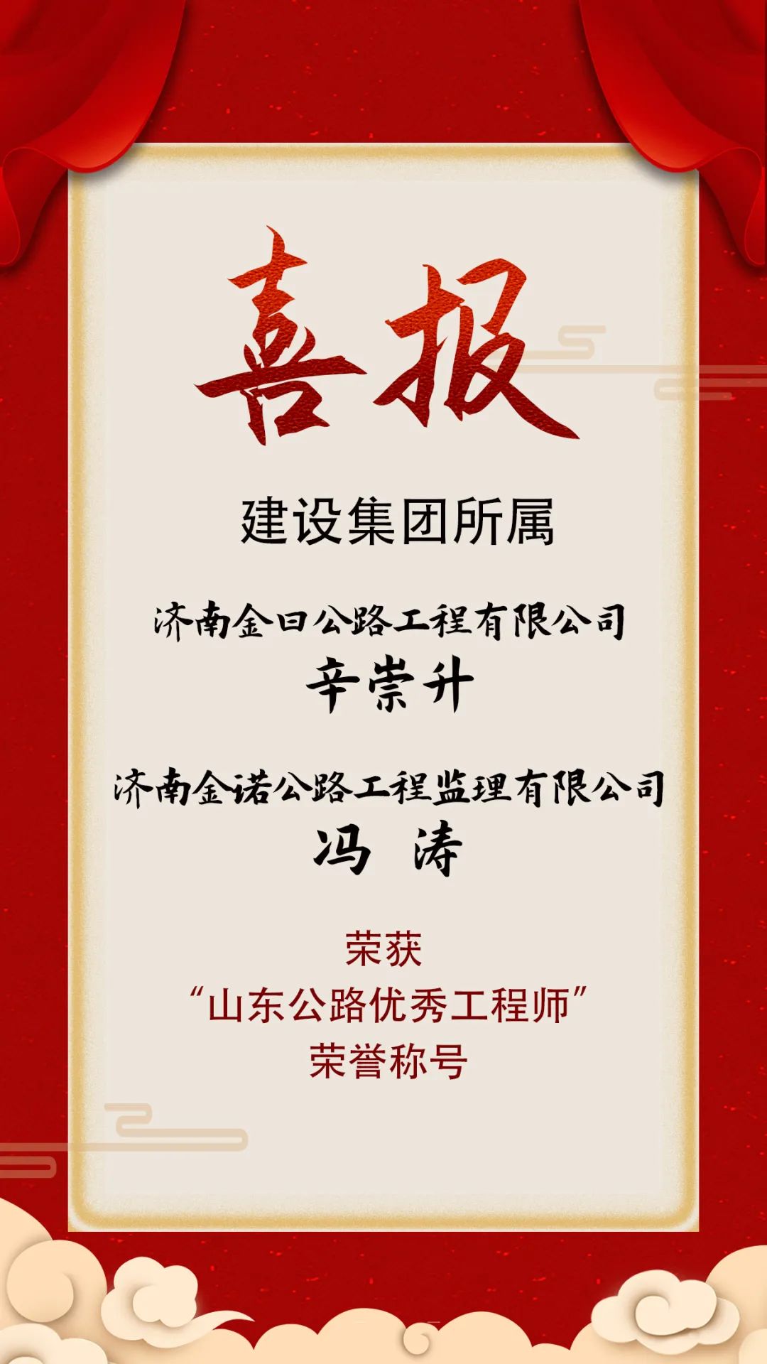近日,山東公路學會發(fā)布《山東公路學會關(guān)于表彰第六屆山東公路優(yōu)秀工程師的決定》的通知,建設集團所屬濟南金曰公路工程有限公司副總經(jīng)理辛崇升、濟南金諾公路工程監(jiān)理有限公司副總經(jīng)理馮濤榮獲 “山東公路優(yōu)秀工程師”榮譽稱號。