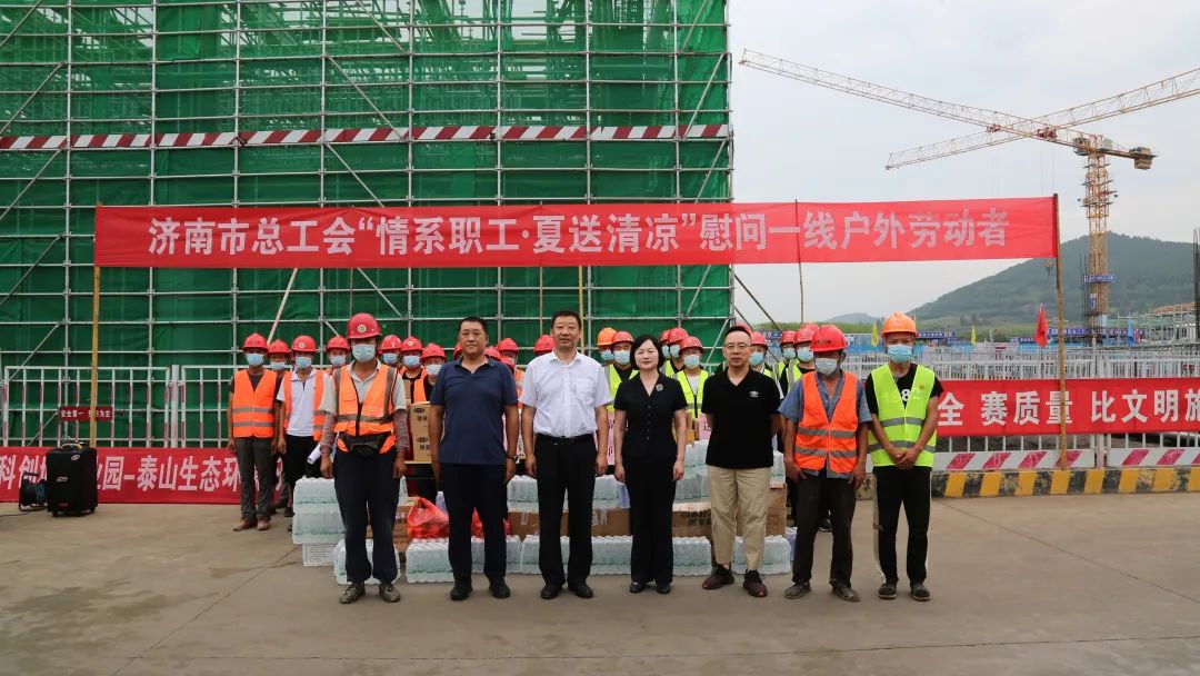 8月12日上午,濟(jì)南市總工會(huì)副主席申世平帶隊(duì)到中科院濟(jì)南科創(chuàng)城產(chǎn)業(yè)園項(xiàng)目現(xiàn)場(chǎng),為一線職工送去防暑降溫物品,慰問(wèn)一線建設(shè)者,市總工會(huì)宣教部二級(jí)調(diào)研員張昭力,建設(shè)集團(tuán)黨委副書(shū)記鐘善良,集團(tuán)工會(huì)相關(guān)負(fù)責(zé)同志參加活動(dòng)。
