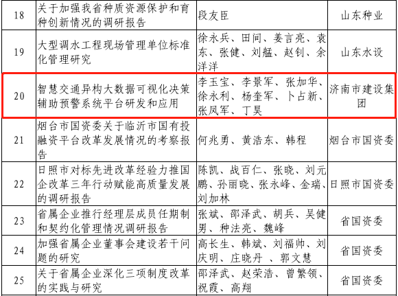近日,山東省國(guó)資委發(fā)布了《山東省國(guó)資委關(guān)于全省國(guó)資國(guó)企系統(tǒng)2021年度優(yōu)秀研究成果評(píng)選結(jié)果的通報(bào)》(魯國(guó)資法規(guī)字〔2022〕11號(hào))文件,濟(jì)南城市建設(shè)集團(tuán)總工辦牽頭,集團(tuán)所屬山東金宇信息集團(tuán)有限公司研究的《智慧交通異構(gòu)大數(shù)據(jù)可視化決策輔助預(yù)警系統(tǒng)平臺(tái)研發(fā)與應(yīng)用》成果榮獲“全省國(guó)資國(guó)企系統(tǒng)2021年度優(yōu)秀研究成果”一等獎(jiǎng)。