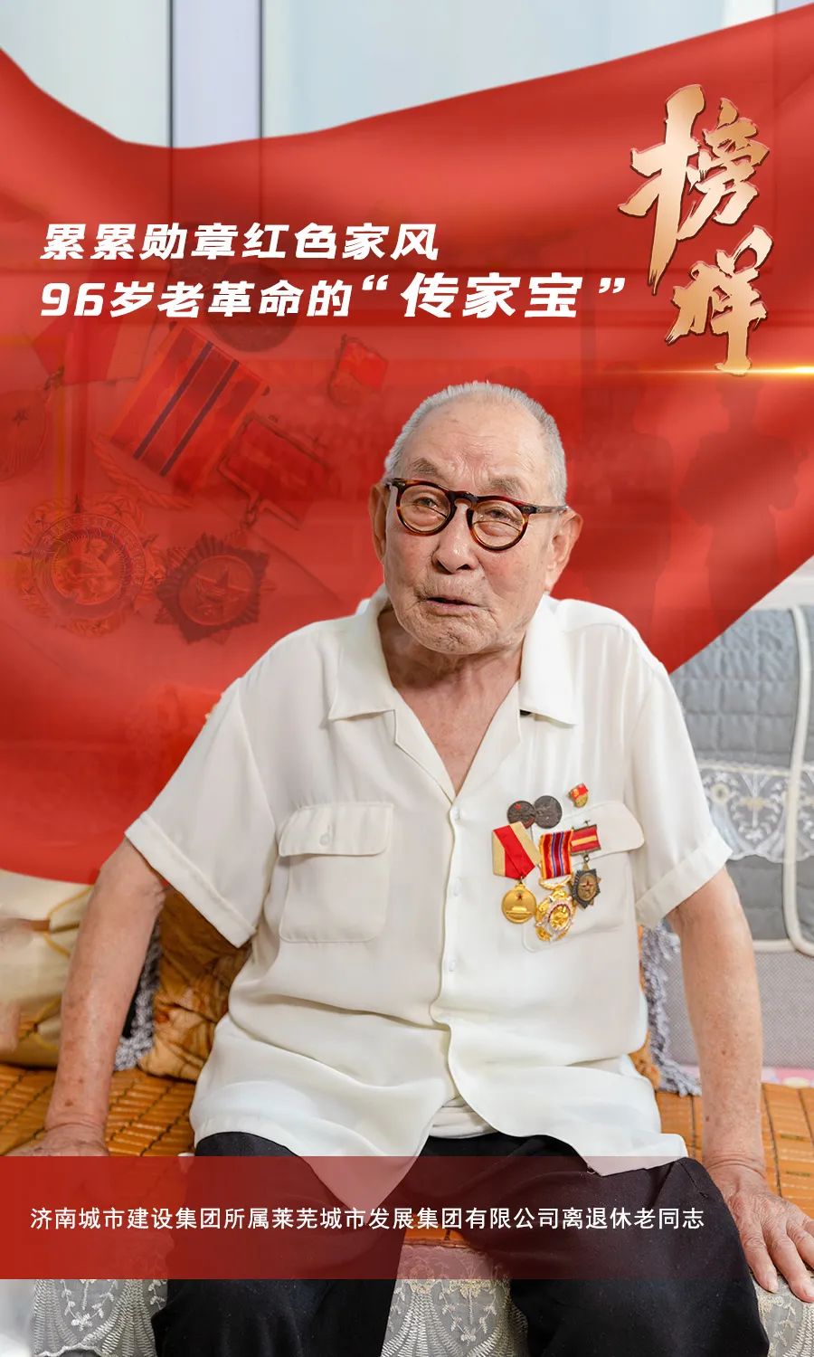 1946年參軍,1948年入黨,參加過濟(jì)南戰(zhàn)役、淮海戰(zhàn)役、渡江戰(zhàn)役、上海戰(zhàn)役、抗美援朝,并多次榮立戰(zhàn)功……在濟(jì)南城市建設(shè)集團(tuán)所屬萊蕪城市發(fā)展集團(tuán)有限公司的離退休老同志中,有這樣一位勛章累累的96歲老革命——戴風(fēng)樓。他謙虛勤懇、艱苦樸素,幾十年革命及工作生涯堅(jiān)定感黨恩、跟黨走;他以身作則、家風(fēng)清正,紅色基因在家庭中、在工作崗位上代代傳承。