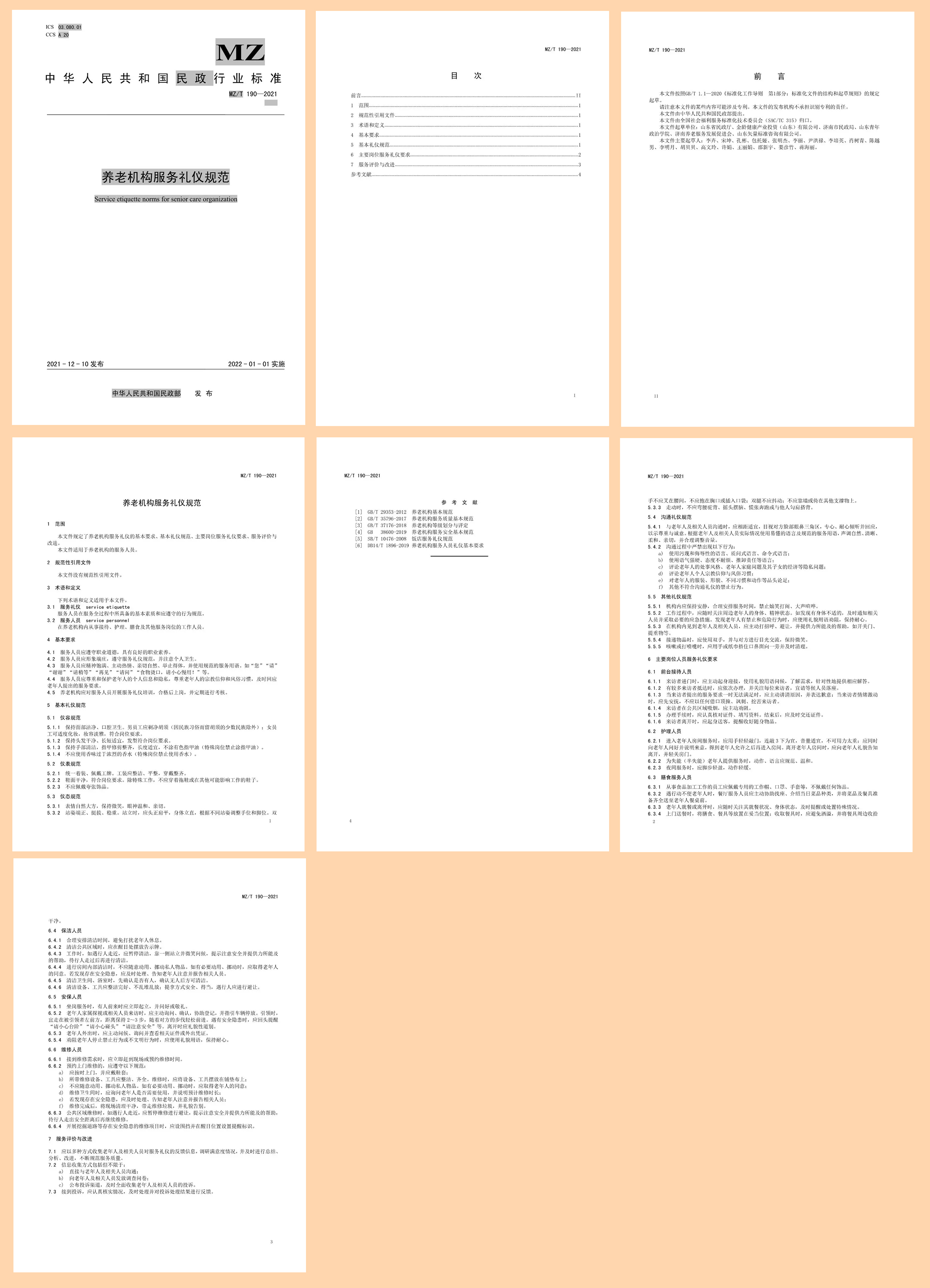 《養(yǎng)老機(jī)構(gòu)服務(wù)禮儀規(guī)范》規(guī)定了養(yǎng)老機(jī)構(gòu)服務(wù)禮儀的基本要求、基本禮儀規(guī)范、主要崗位服務(wù)禮儀要求、服務(wù)評(píng)價(jià)與改進(jìn),適用于所有養(yǎng)老機(jī)構(gòu)的服務(wù)人員。