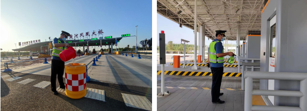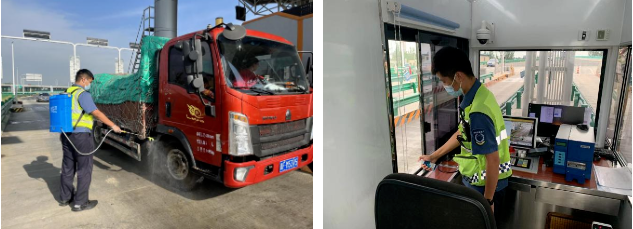 收費(fèi)員加固防撞桶并對(duì)工作現(xiàn)場(chǎng)進(jìn)行消殺