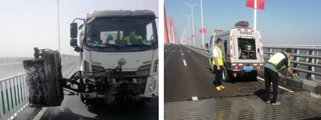 對(duì)橋面、防護(hù)欄進(jìn)行深度保潔,為過(guò)往司乘提供舒適的出行環(huán)境。