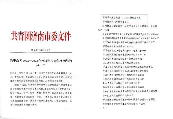近日,共青團(tuán)濟(jì)南市委印發(fā)了《關(guān)于命名2022-2023年度濟(jì)南市青年文明號的決定》,集團(tuán)“12345”熱線辦公室、濟(jì)南新城文化傳媒有限公司兩家集體獲評2022-2023年度濟(jì)南市青年文明號。