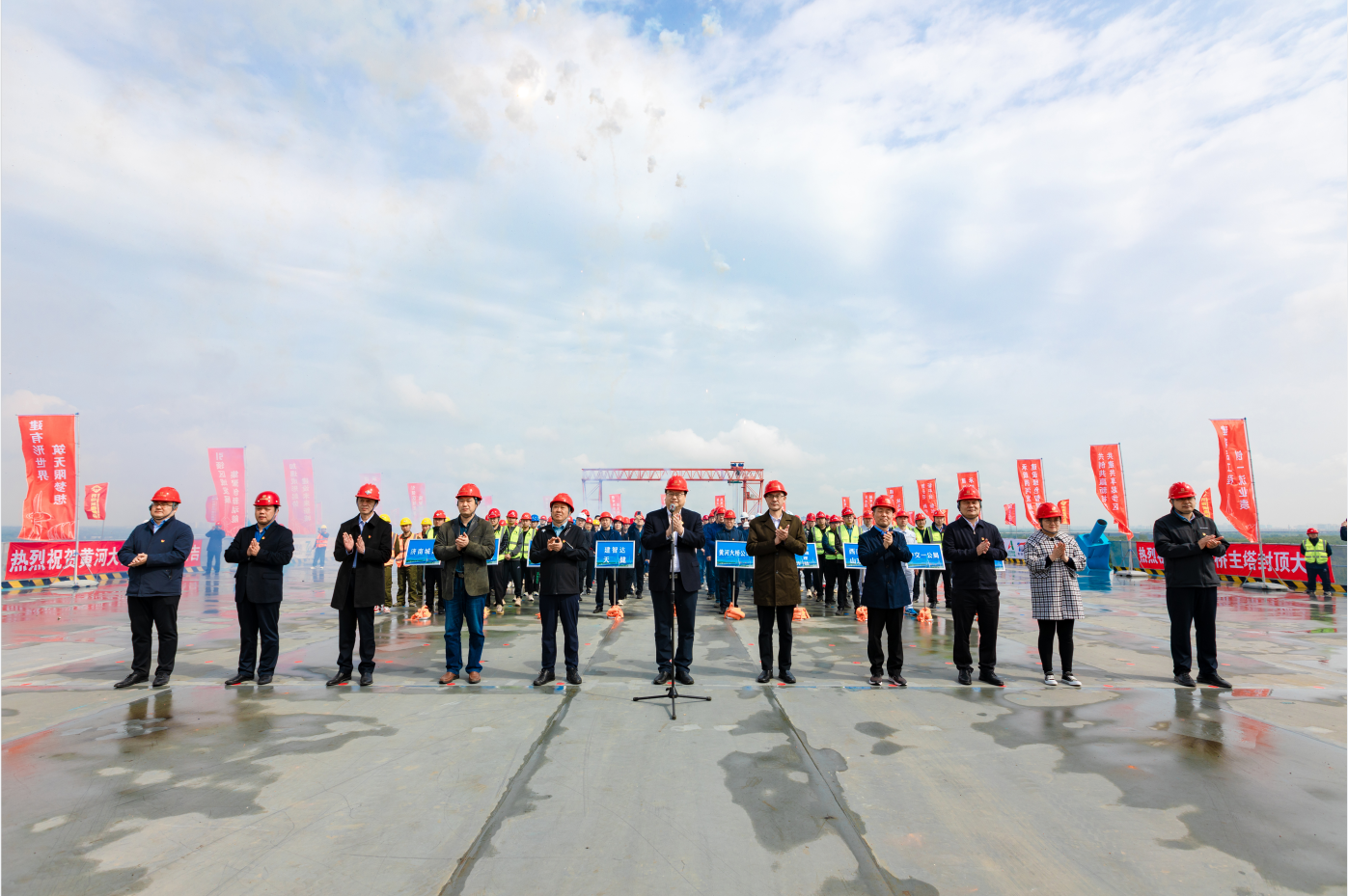 4月28日上午,由濟南城市建設(shè)集團負責建設(shè)的濟南黃河公路大橋工程主塔順利封頂,較原計劃工期提前5個月實現(xiàn)關(guān)鍵性重大控制節(jié)點突破,為大橋項目建成通車奠定堅實基礎(chǔ)。市委主題教育第十七巡回指導(dǎo)組組長楊長軍及指導(dǎo)組成員觀摩指導(dǎo),建設(shè)集團黨委書記、董事長史海成宣布封頂,黨委副書記、總經(jīng)理許為民,集團總經(jīng)理助理、安全總監(jiān)解漢忠參加活動。