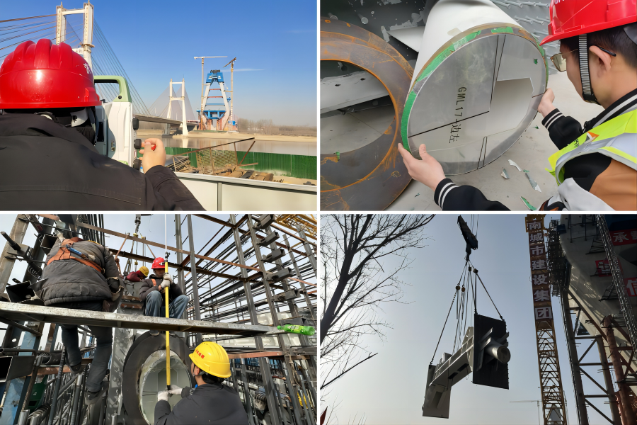 主塔上塔柱鋼錨梁共17對,單個最大重量9.3噸,索導(dǎo)管長度最大達5.4米。項目部根據(jù)導(dǎo)管尺寸,專門設(shè)計定制管口測量工裝,在鋼錨梁吊裝前安裝定位工裝,實現(xiàn)吊裝動態(tài)觀測,將“隱形點”可視化,保證了預(yù)埋準確度,大幅提升施工作業(yè)工效。