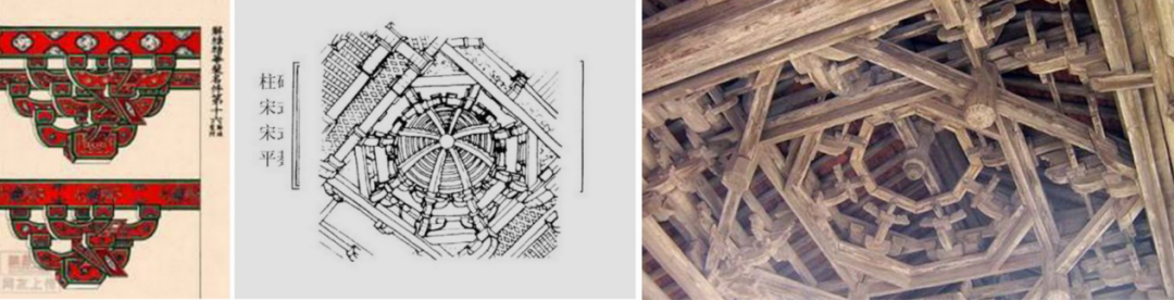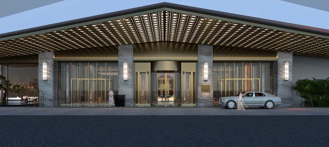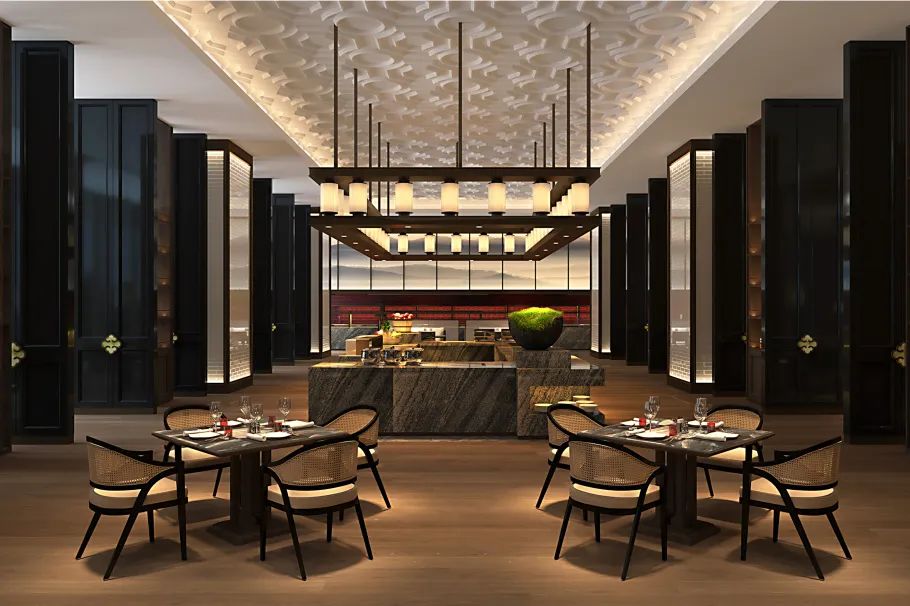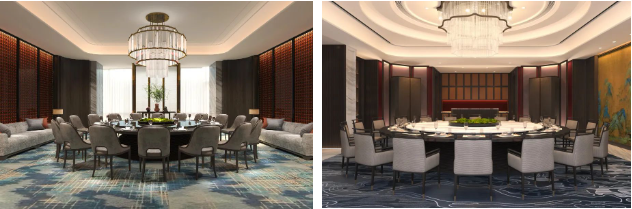 宴會廳天花的設計借鑒宋式屋架結構,通過現(xiàn)代設計手法進行簡化概括形成符合現(xiàn)代人審美的造型裝置藝術。