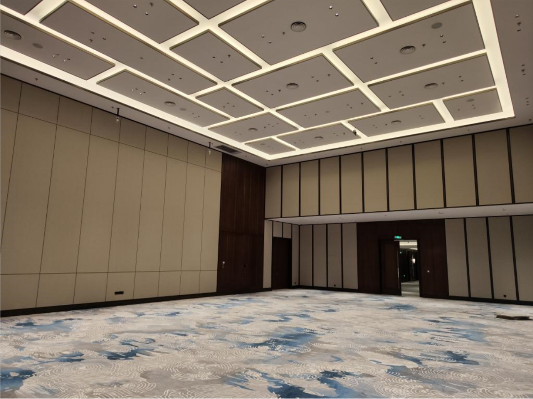 酒店大堂和過廳吊頂為異型鋁型材格柵吊頂,大宴會廳吊頂為多層鋁方通交錯布置造型,項目團隊使用BIM建模技術,優(yōu)化施工工藝提高了施工效率,僅此一項節(jié)省工期30天,項目團隊群策群力科學組織各項施工,7天完成地毯鋪裝18000平方米,10天完成墻面硬包安裝20000平方米,40天完成大理石鋪貼和干掛施工3.4萬平方米,項目如期通過驗收,為酒店開業(yè)奠定堅實的基礎。