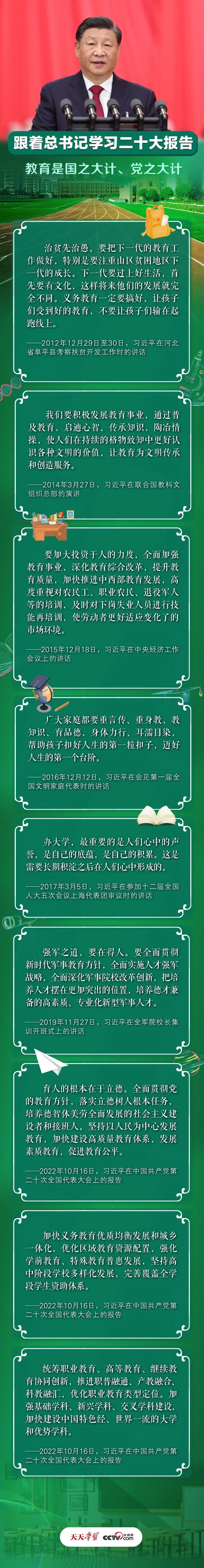 黨的十八大以來,以習(xí)近平同志為核心的黨中央高度重視教育事業(yè),對教育工作作出了一系列重要部署和重要決策,推動教育事業(yè)取得歷史性成就。習(xí)近平總書記曾在不同場合對義務(wù)教育、高等教育、家庭教育、職業(yè)教育等多方面作出重要論述。央視網(wǎng)《天天學(xué)習(xí)》特推出長圖解,與您一同學(xué)習(xí)領(lǐng)會總書記的教育觀。