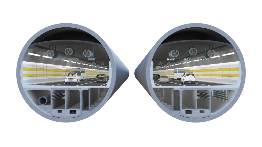為減少市政管線過黃河成本,充分利用市政隧道下部通道資源搭載穿黃河市政管線,隧道下部預(yù)留穿黃河市政管線艙。同時,盾構(gòu)段采用在車行道路面下設(shè)置逃生疏散樓梯與專用逃生救援通道(縱向逃生救援方案),并結(jié)合工作井設(shè)置車行橫通道、明挖暗埋段設(shè)置人行橫通道的縱向結(jié)合橫向疏散救援的綜合方案,形成可靠高效的疏散救援設(shè)施,確保運行安全。